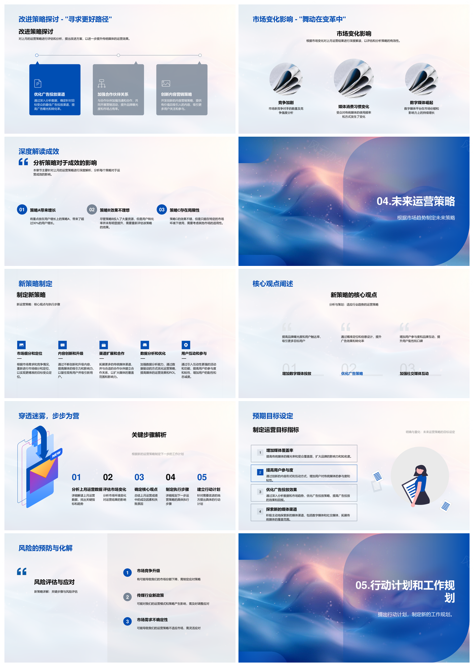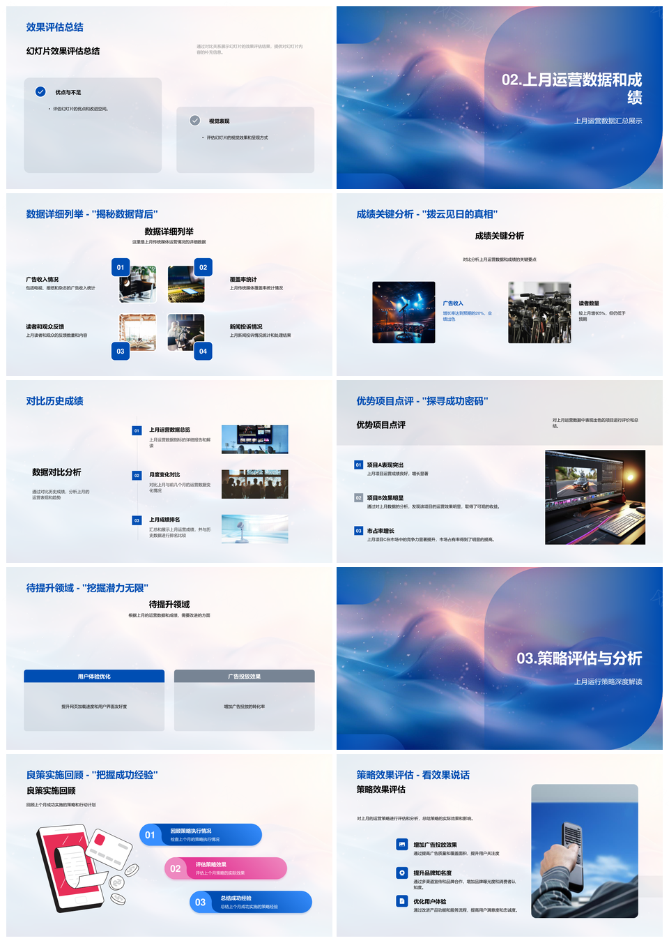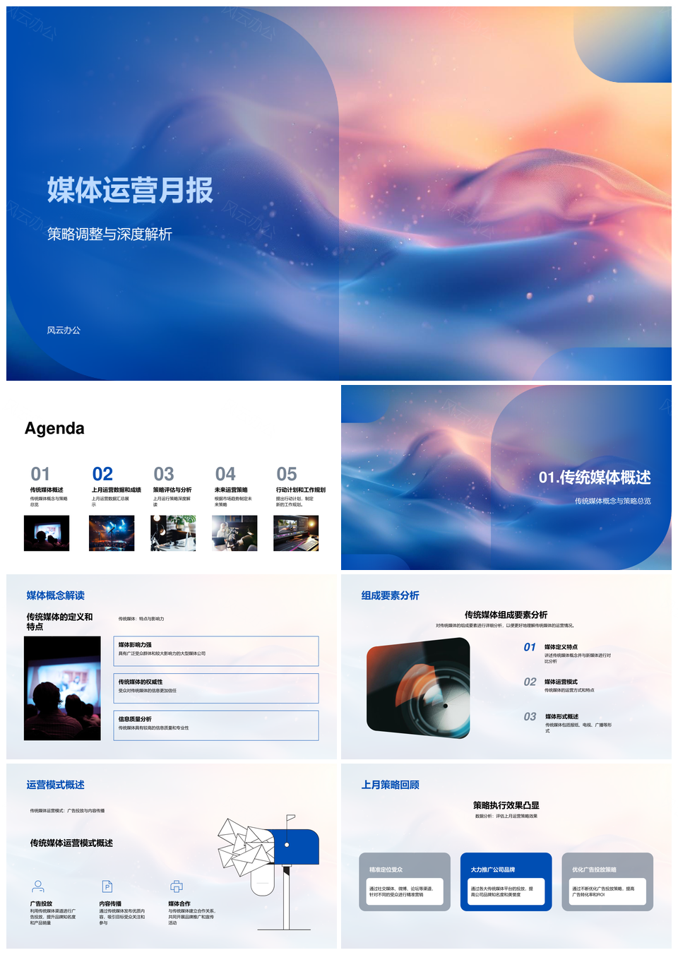 风云办公提供的媒体运营策略调整效果评估月报解析PPT模板,下载格式为pptx,一共33页,作品中文字及图均可以修改和编辑,图片更改请在作品中右键图片并更换,文字修改请直接点击文字进行修改。