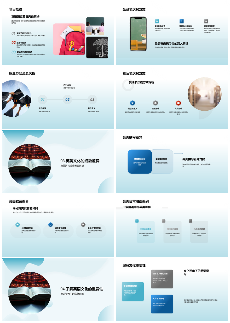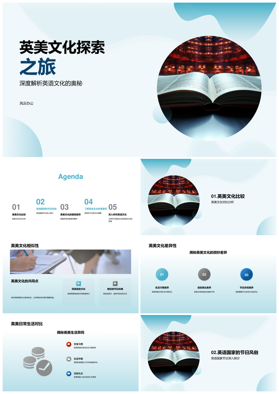 风云办公提供的英美文化差异节日生活语言对比探析PPT模板,下载格式为pptx,一共24页,作品中文字及图均可以修改和编辑,图片更改请在作品中右键图片并更换,文字修改请直接点击文字进行修改。