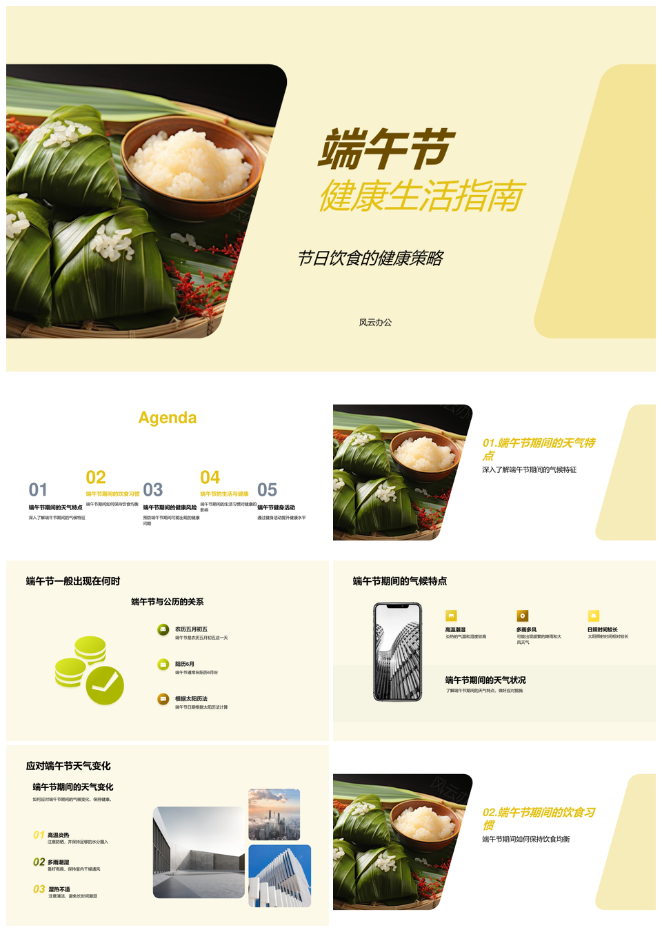 风云办公提供的端午节健康食粽均衡饮食防风险PPT模板,下载格式为pptx,一共23页,作品中文字及图均可以修改和编辑,图片更改请在作品中右键图片并更换,文字修改请直接点击文字进行修改。