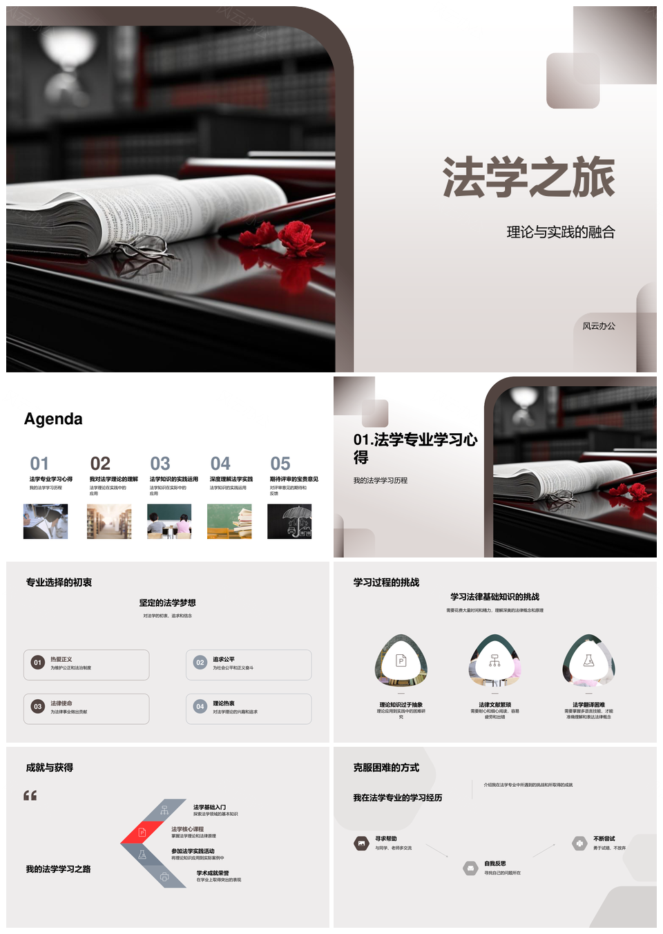 风云办公提供的法学之旅毕业答辩理论实践融合PPT模板,下载格式为pptx,一共33页,作品中文字及图均可以修改和编辑,图片更改请在作品中右键图片并更换,文字修改请直接点击文字进行修改。