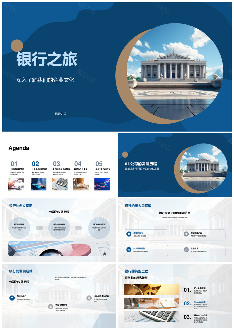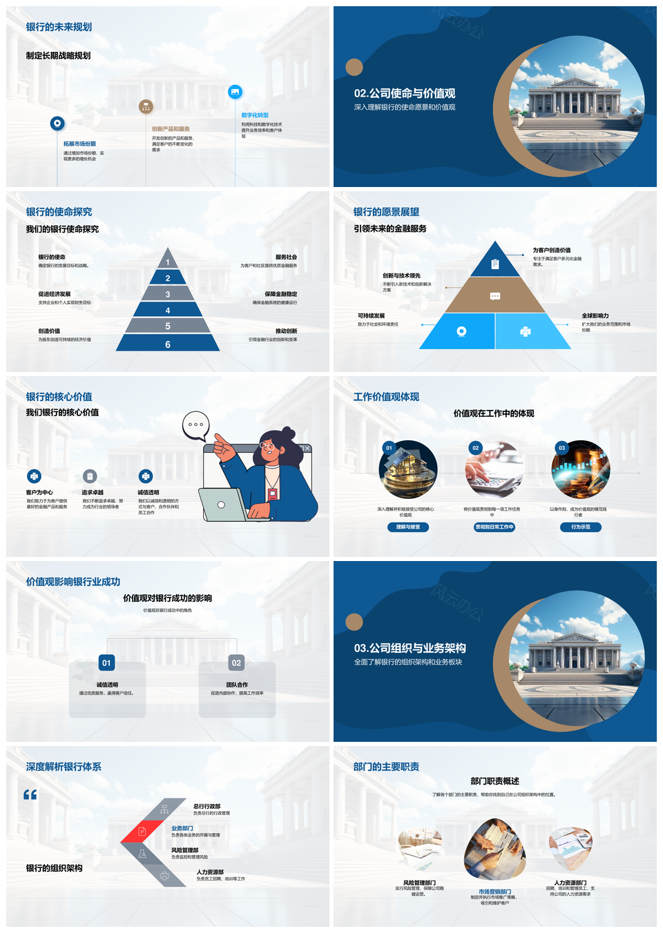 风云办公提供的银行新员培启文化使命大楼传PPT模板,下载格式为pptx,一共33页,作品中文字及图均可以修改和编辑,图片更改请在作品中右键图片并更换,文字修改请直接点击文字进行修改。