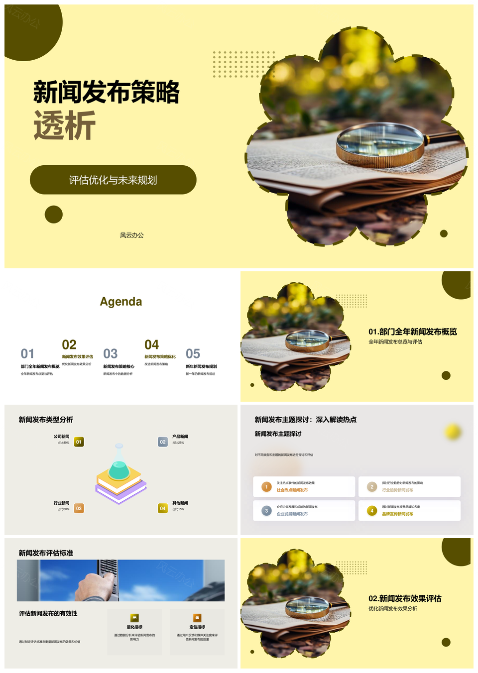风云办公提供的新闻发布策略评估优化未来规划PPT模板,下载格式为pptx,一共23页,作品中文字及图均可以修改和编辑,图片更改请在作品中右键图片并更换,文字修改请直接点击文字进行修改。