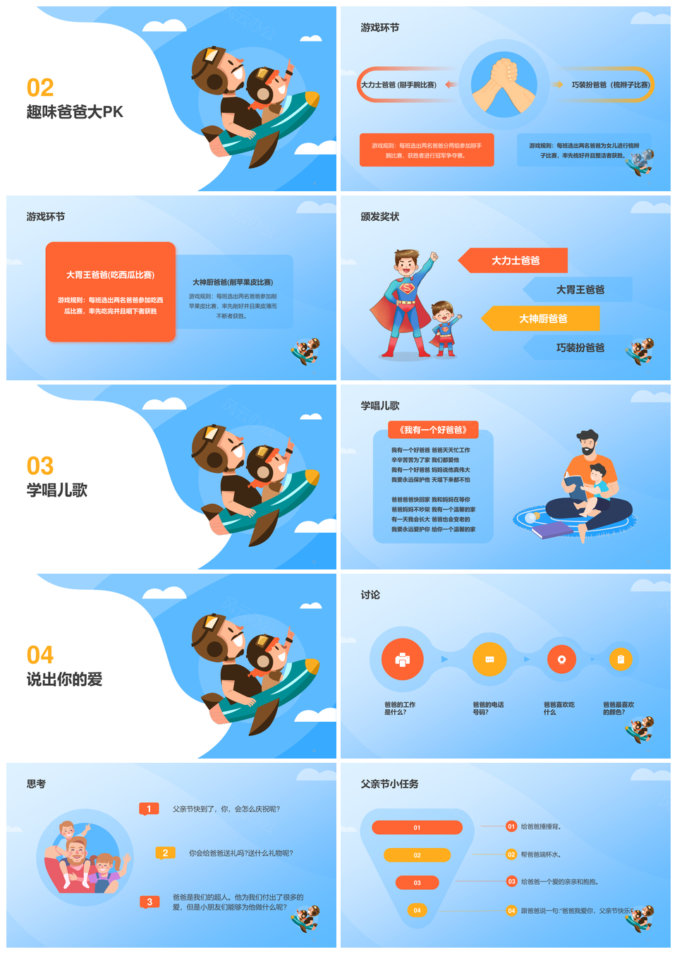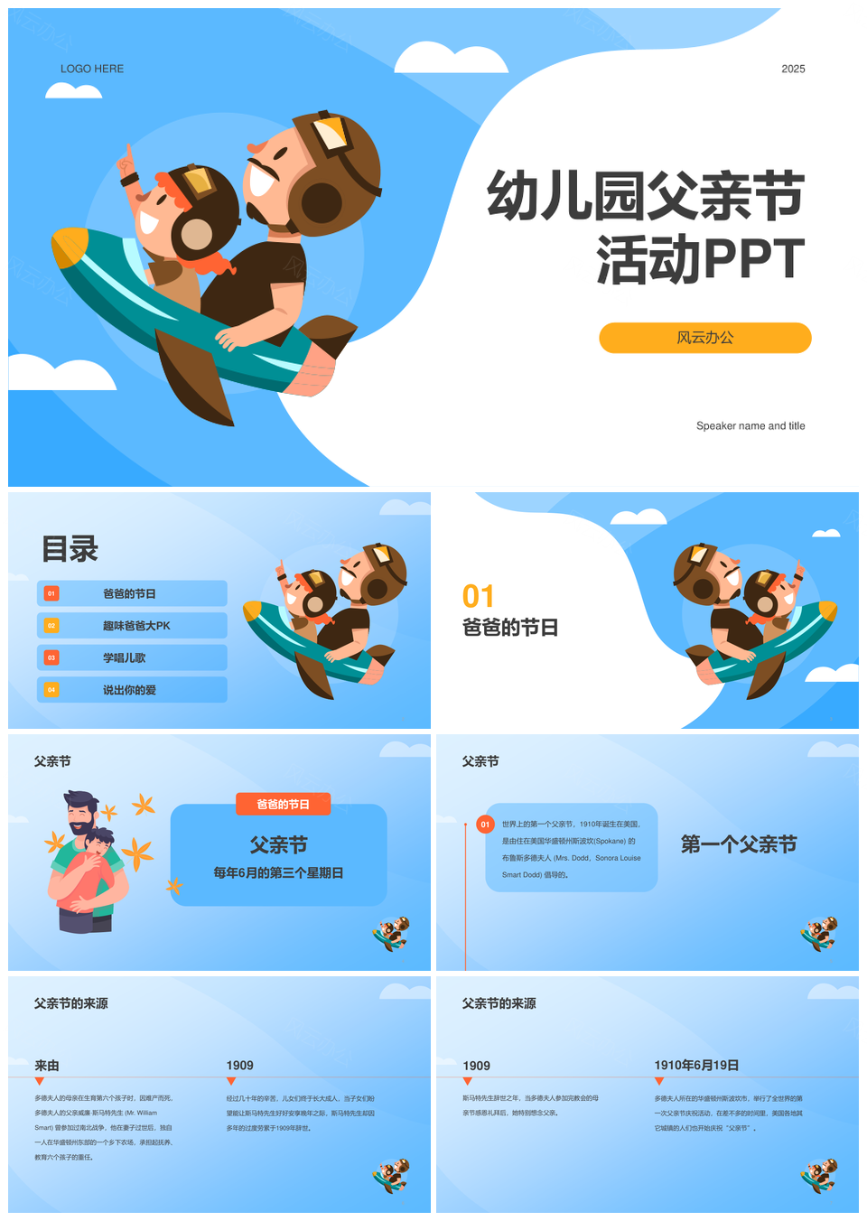 这是一张2025蓝色卡通父亲节活动策划教育插画PPT模板,包含2025、蓝色、卡通、父亲节、活动、策划、教育、插画等主题内容,也可用作2025蓝色卡通父亲节活动策划、蓝色卡通父亲节活动策划、卡通父亲节活动策划教育、父亲节活动策划教育插画、蓝色卡通教育插画策划、2025蓝色卡通父亲节、蓝色卡通父亲节活动、卡通父亲节活动策划、父亲节活动策划教育、活动策划教育插画、蓝色卡通教育插画、卡通父亲节教育插画、2025父亲节活动、蓝色卡通插画、父亲节教育插画等PPT场景使用。 风云办公提供的2025蓝色卡通父亲节活动策划教育插画PPT模板,下载格式为pptx,一共18页,作品中文字及图均可以修改和编辑,图片更改请在作品中右键图片并更换,文字修改请直接点击文字进行修改。