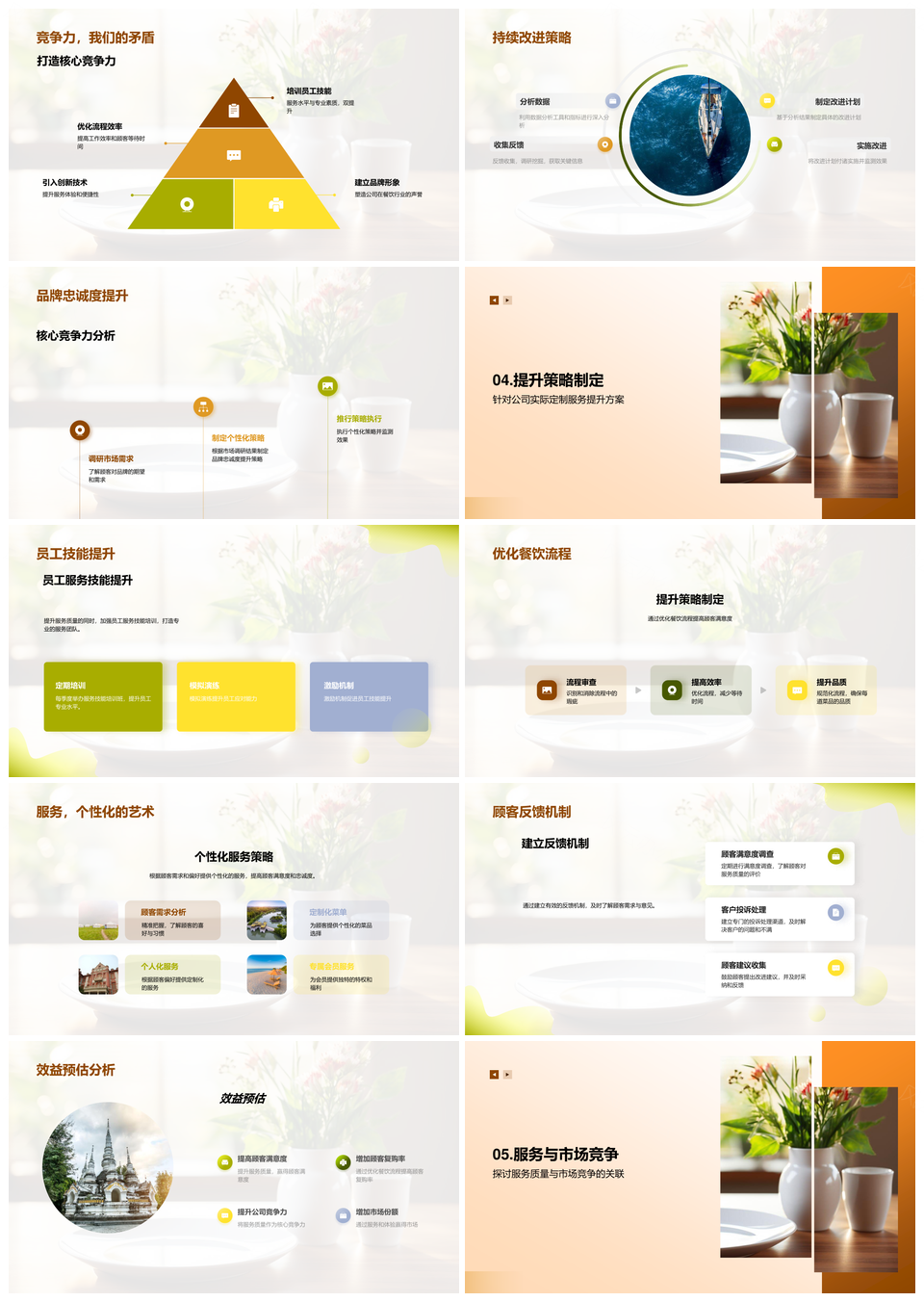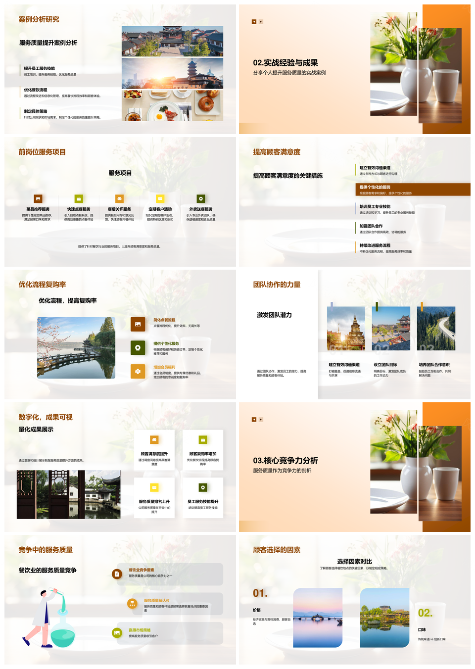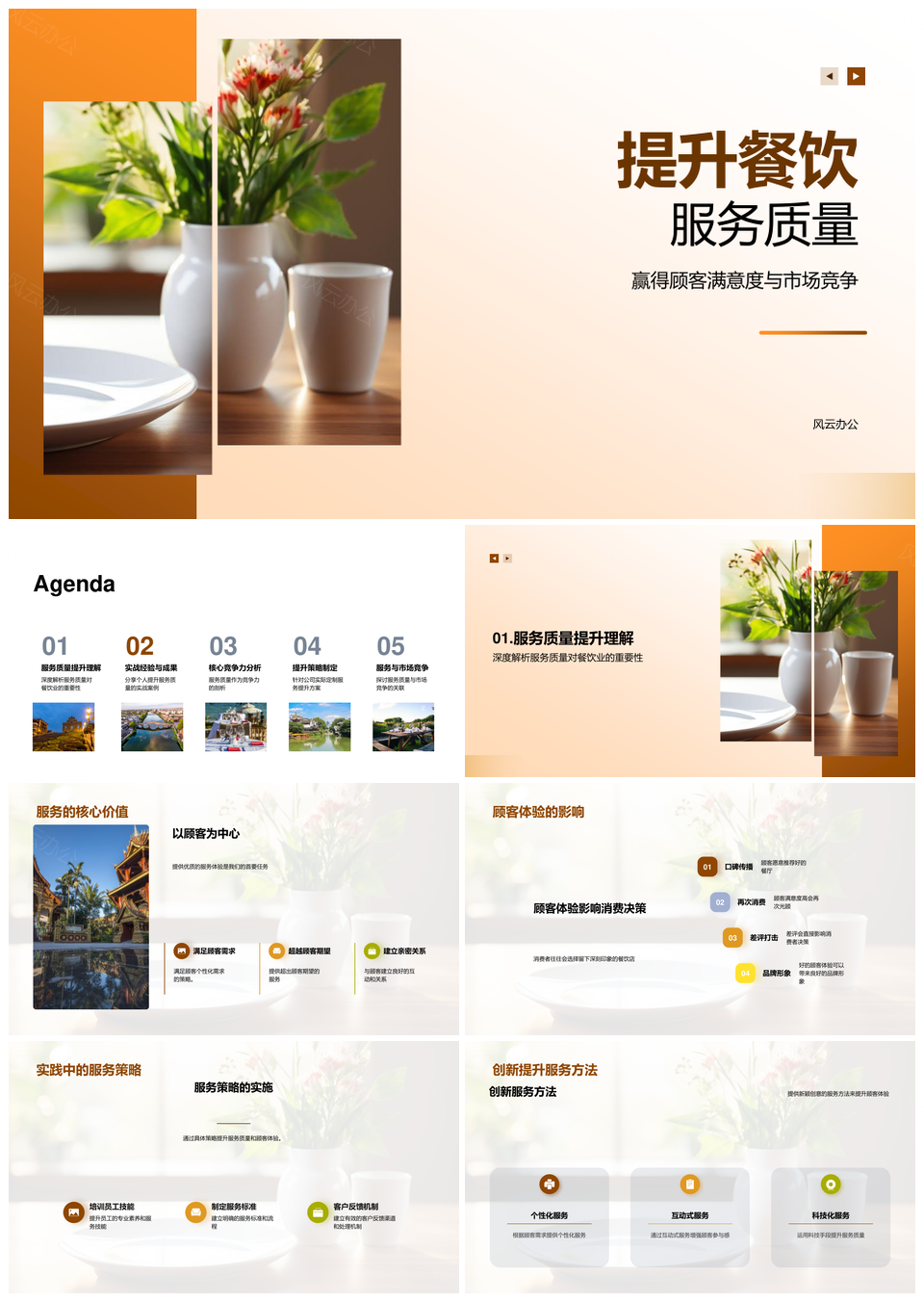 这是一张提升餐饮服务质量优化流程增强顾客体验满意度PPT模板,包含餐饮服务质量、流程、顾客体验满意度等主题内容,也可用作提升餐饮服务质量优化流程、提升餐饮服务质量、餐饮服务质量优化流程、服务质量优化流程增强、增强顾客体验满意度、提升餐饮服务、餐饮服务质量、服务质量优化、质量优化流程、优化流程增强、增强顾客体验、顾客体验满意度、提升餐饮、餐饮服务、服务质量等PPT场景使用。 风云办公提供的提升餐饮服务质量优化流程增强顾客体验满意度PPT模板,下载格式为pptx,一共33页,作品中文字及图均可以修改和编辑,图片更改请在作品中右键图片并更换,文字修改请直接点击文字进行修改。