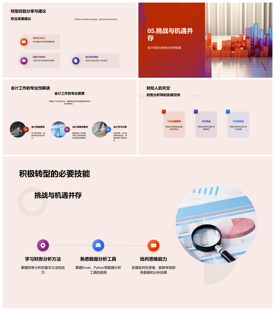风云办公提供的会计向财务分析师转型技能挑战与机遇PPT模板,下载格式为pptx,一共23页,作品中文字及图均可以修改和编辑,图片更改请在作品中右键图片并更换,文字修改请直接点击文字进行修改。
