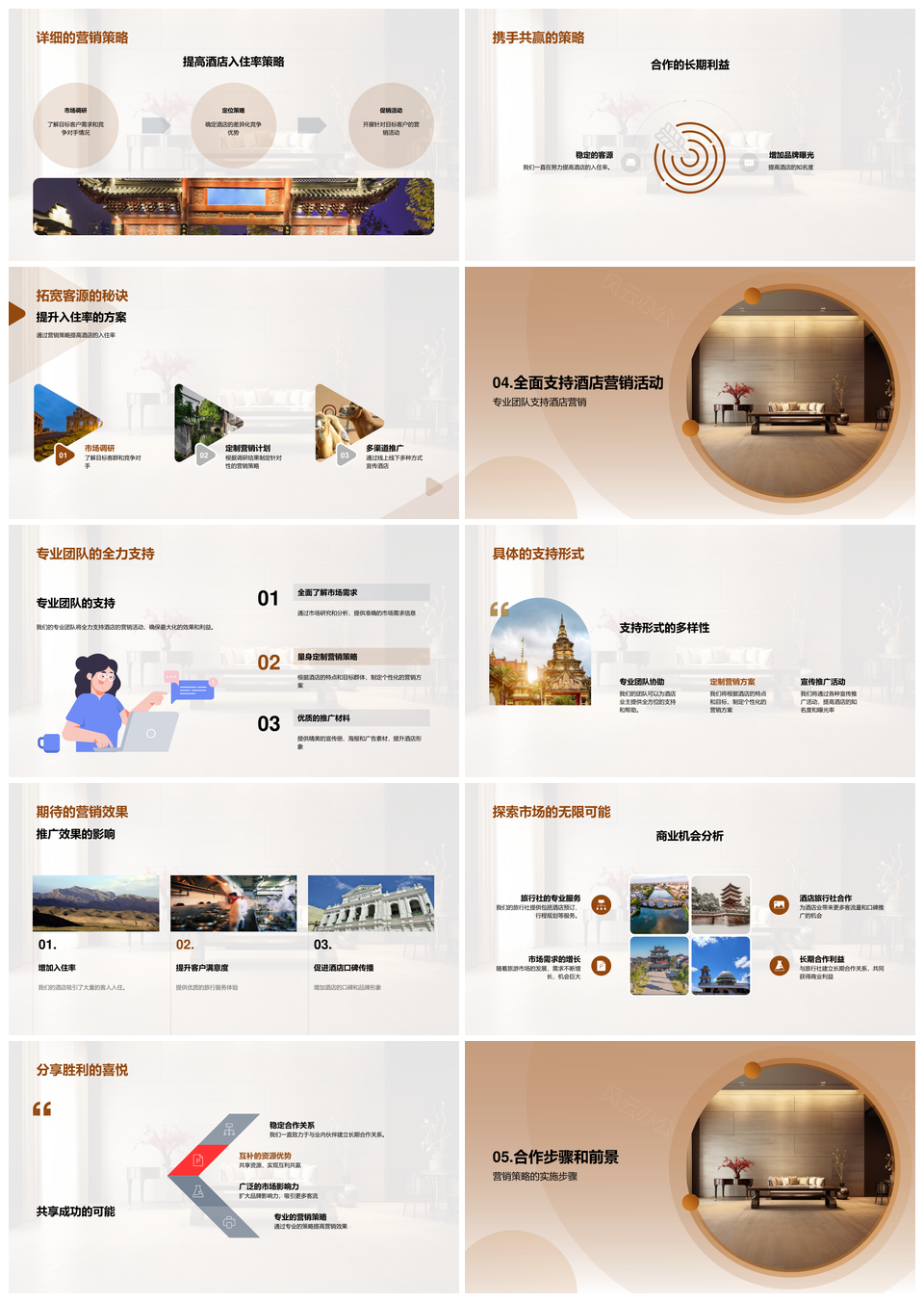 风云办公提供的旅行社专业团队助酒店业全球营销PPT模板,下载格式为pptx,一共33页,作品中文字及图均可以修改和编辑,图片更改请在作品中右键图片并更换,文字修改请直接点击文字进行修改。