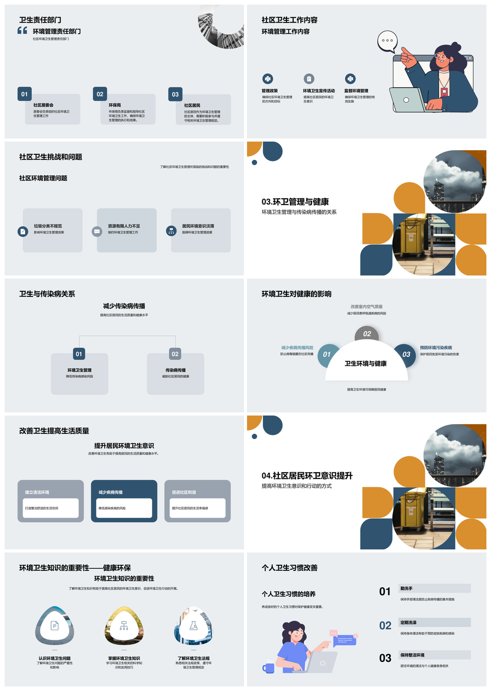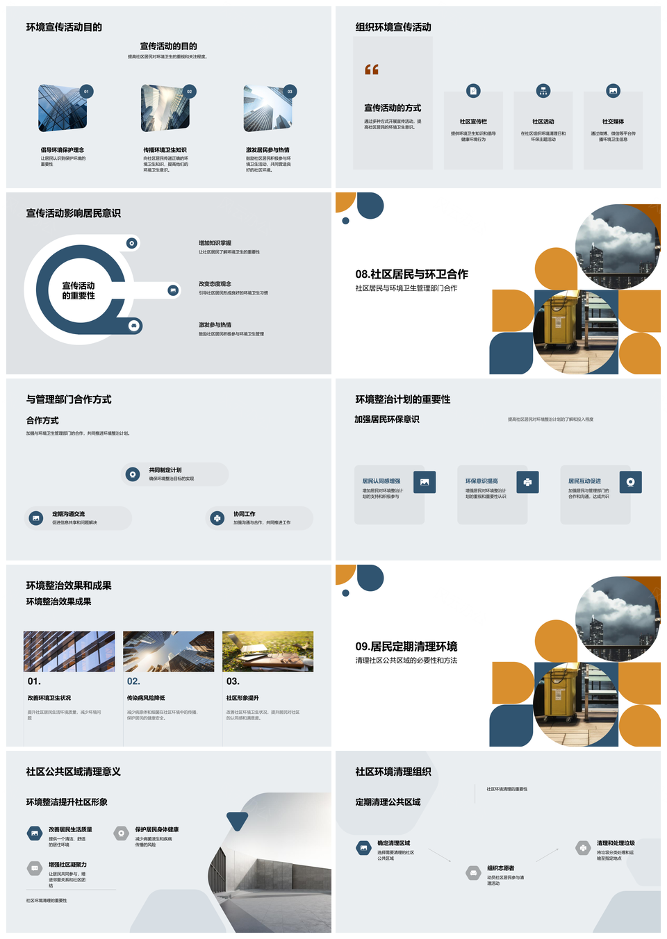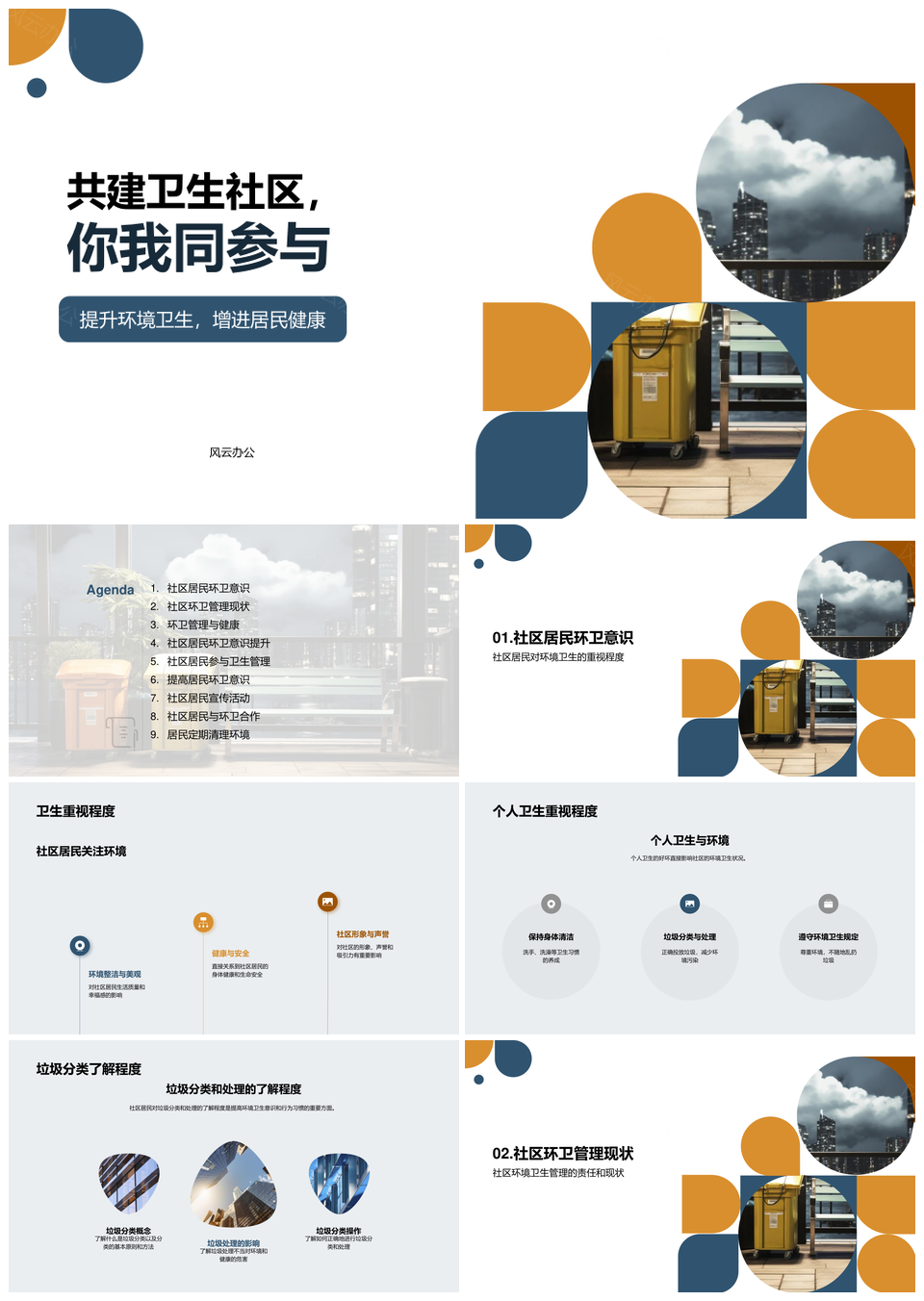 风云办公提供的社区居民共创清洁社区共享健康生活PPT模板,下载格式为pptx,一共39页,作品中文字及图均可以修改和编辑,图片更改请在作品中右键图片并更换,文字修改请直接点击文字进行修改。