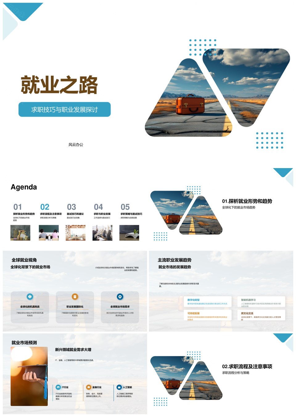 风云办公提供的就业求职技巧职业趋势发展路标PPT模板,下载格式为pptx,一共24页,作品中文字及图均可以修改和编辑,图片更改请在作品中右键图片并更换,文字修改请直接点击文字进行修改。