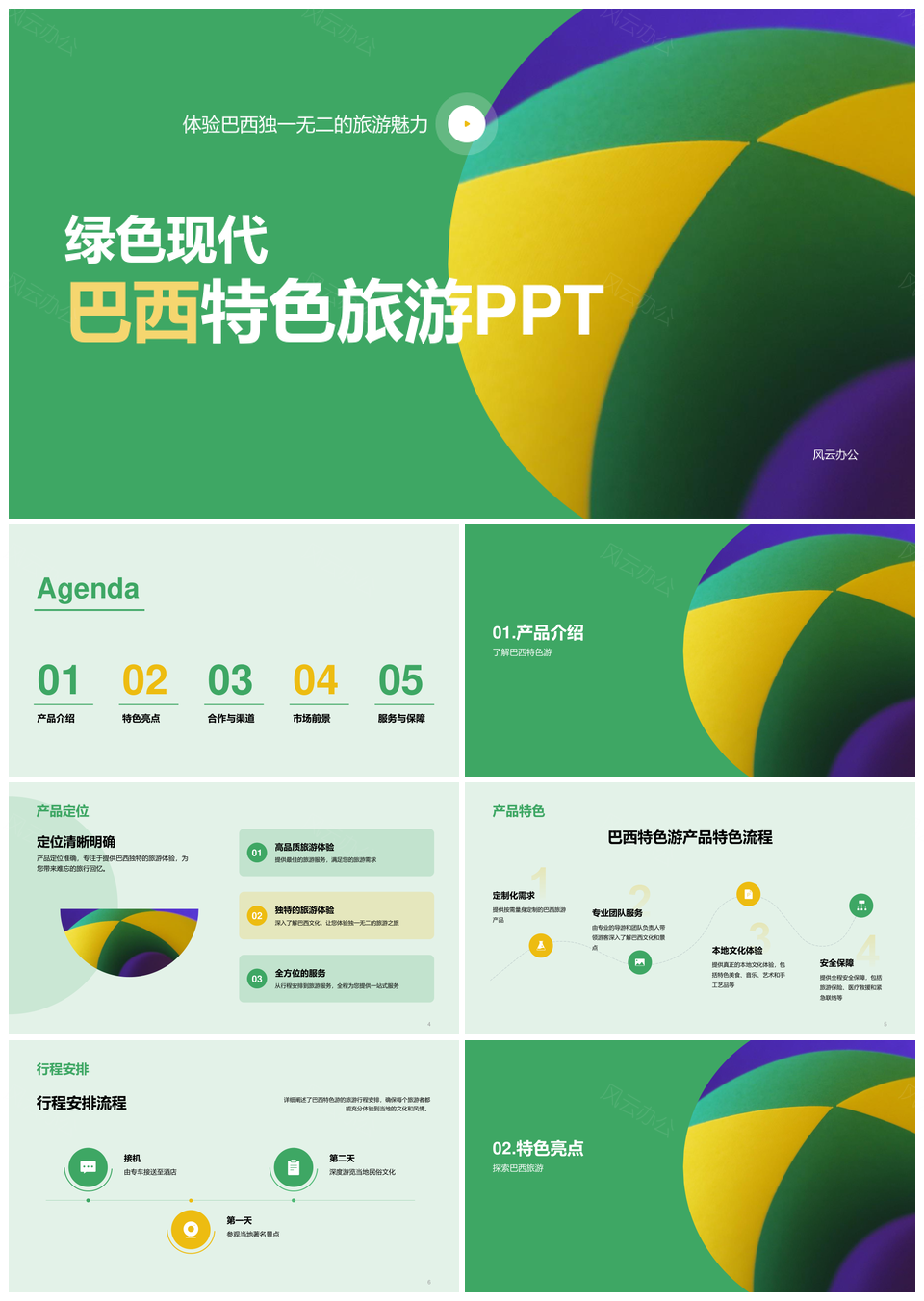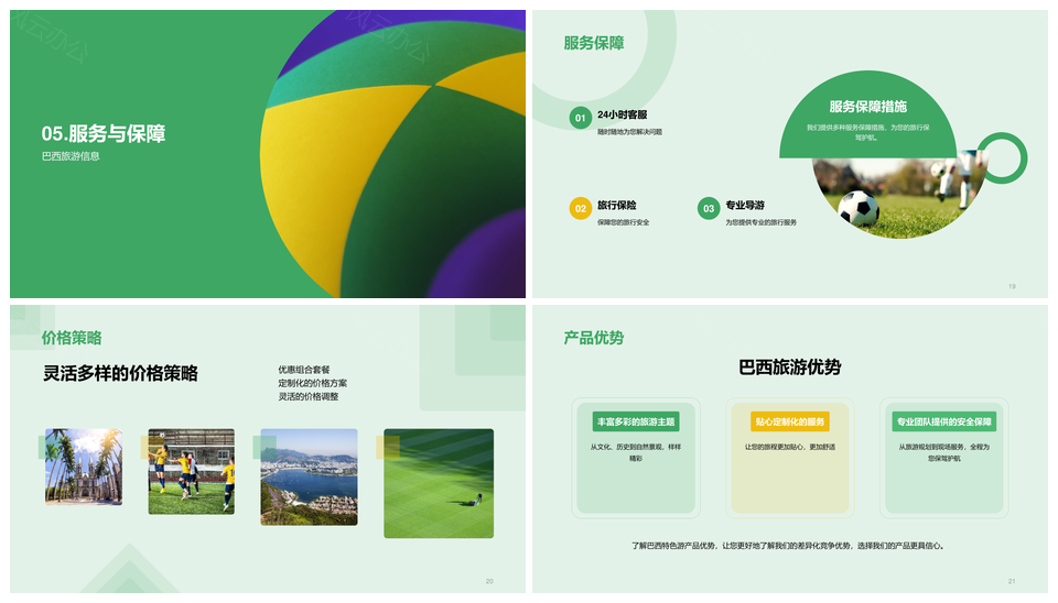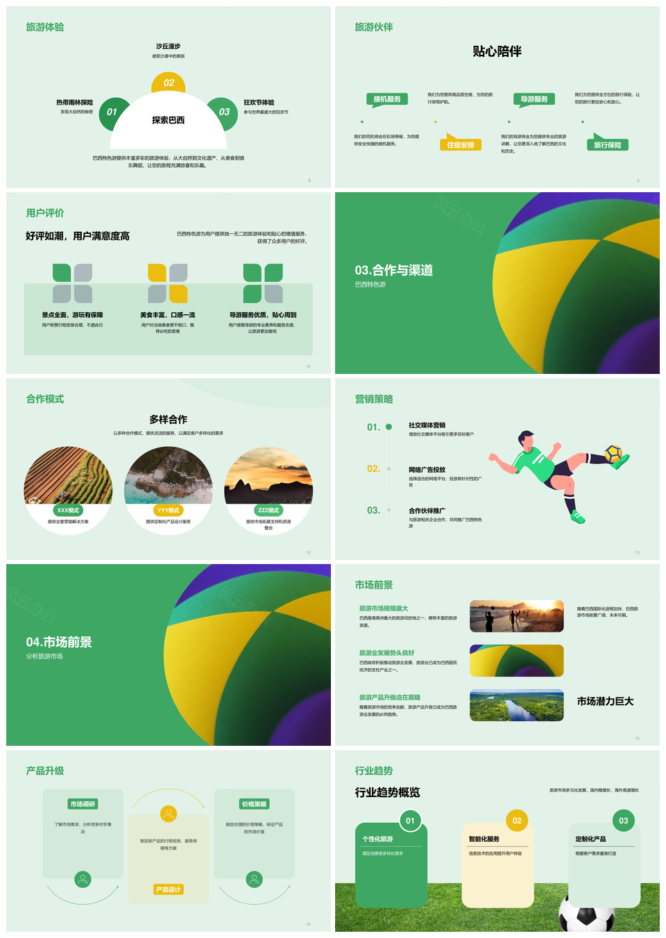 风云办公提供的绿色现代巴西国家旅游足球攻略PPT模板,下载格式为pptx,一共22页,作品中文字及图均可以修改和编辑,图片更改请在作品中右键图片并更换,文字修改请直接点击文字进行修改。