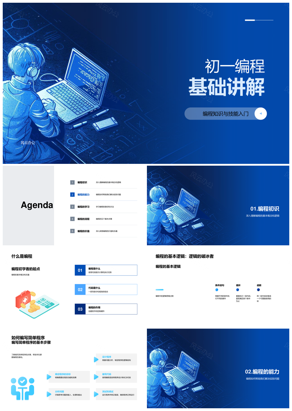 风云办公提供的初一编程基础与开发控制技能PPT模板,下载格式为pptx,一共25页,作品中文字及图均可以修改和编辑,图片更改请在作品中右键图片并更换,文字修改请直接点击文字进行修改。
