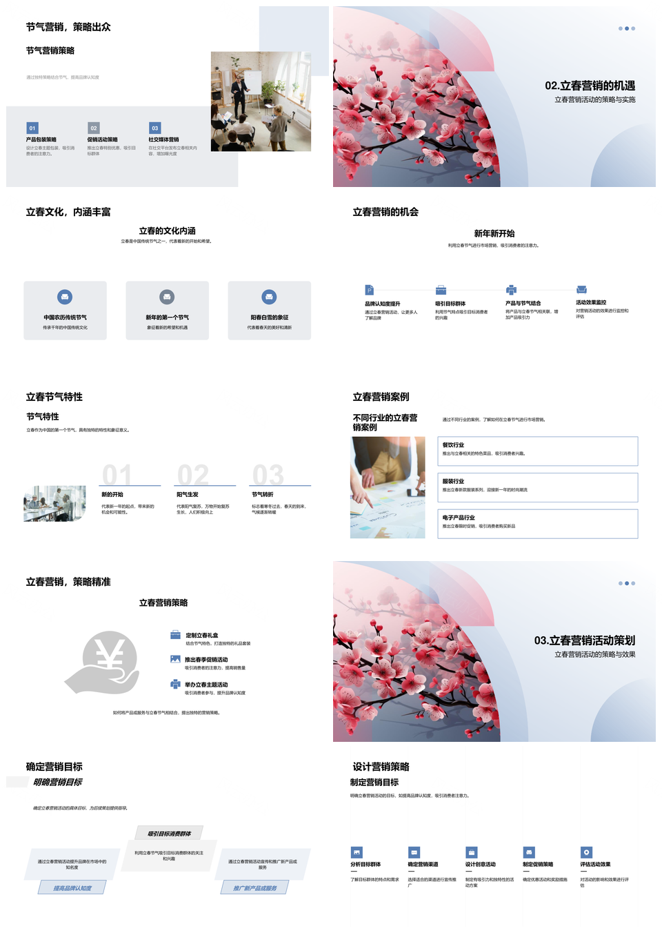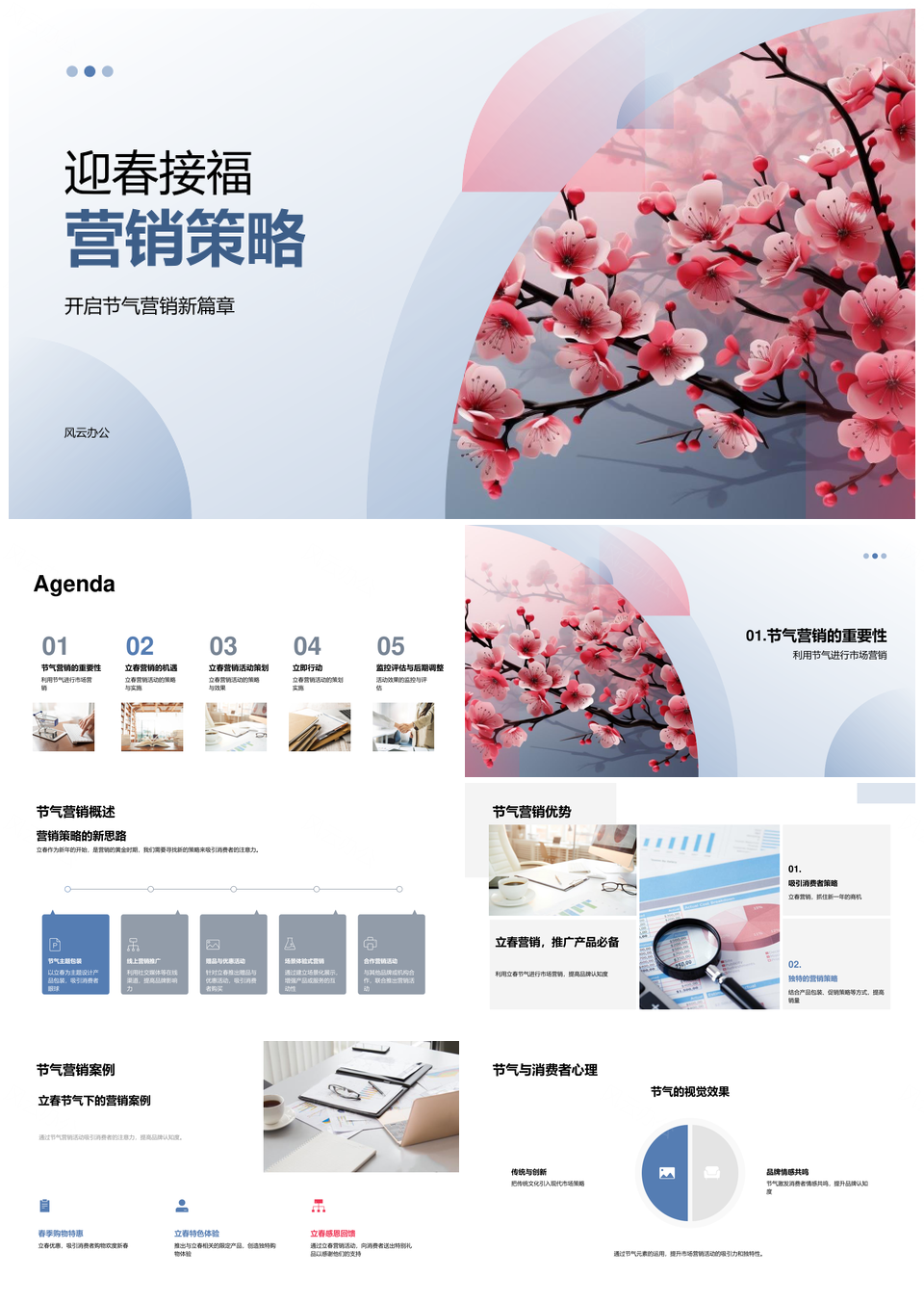 这是一张立春迎春节气营销品牌促销包装樱花群体策略PPT模板,包含立春、春节、气营销、品牌、促销、包装、樱花、群体、策略等主题内容,也可用作立春迎春节气营销、迎春节气营销品牌、节气营销品牌促销、营销品牌促销包装、品牌促销包装樱花、促销包装樱花群体、包装樱花群体策略、立春迎春营销品牌、迎春品牌促销包装、立春促销包装樱花、节气品牌群体策略、营销促销樱花群体、立春节气樱花策略、迎春樱花群体策略、品牌包装樱花策略等PPT场景使用。 风云办公提供的立春迎春节气营销品牌促销包装樱花群体策略PPT模板,下载格式为pptx,一共33页,作品中文字及图均可以修改和编辑,图片更改请在作品中右键图片并更换,文字修改请直接点击文字进行修改。