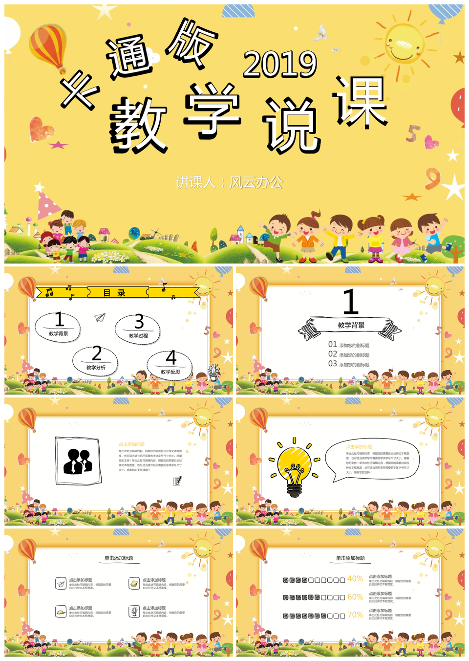 风云办公提供的黄色卡通尅爱教学说课PPT模板,下载格式为pptx,一共20页,作品中文字及图均可以修改和编辑,图片更改请在作品中右键图片并更换,文字修改请直接点击文字进行修改。