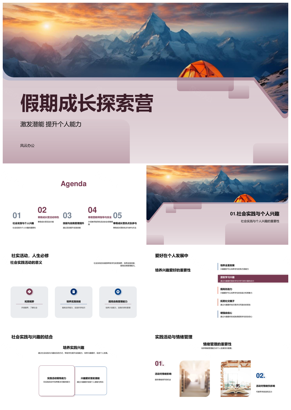 风云办公提供的假期兴趣技能实践安全露营成长营PPT模板,下载格式为pptx,一共33页,作品中文字及图均可以修改和编辑,图片更改请在作品中右键图片并更换,文字修改请直接点击文字进行修改。