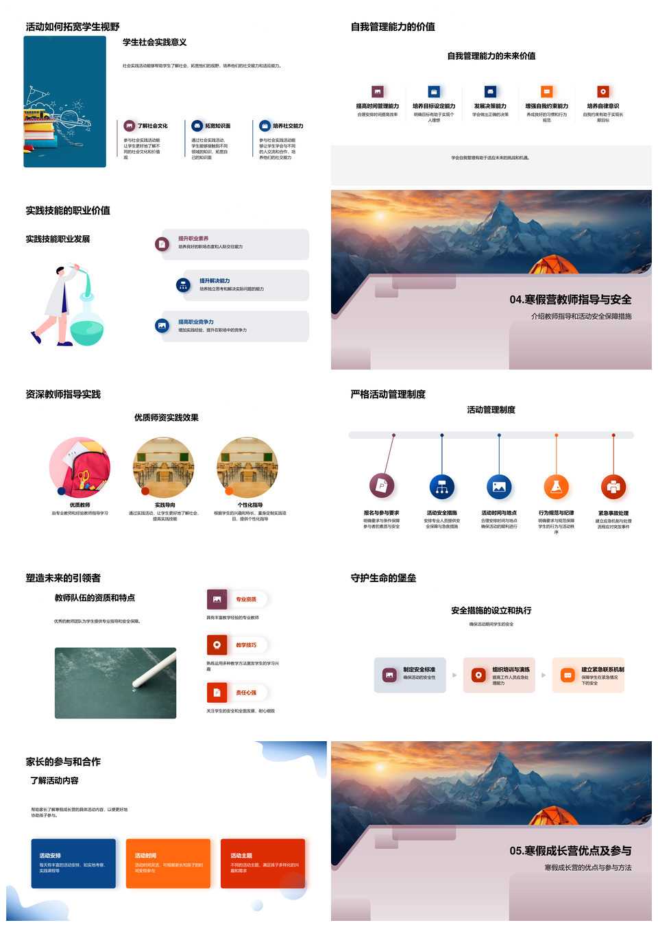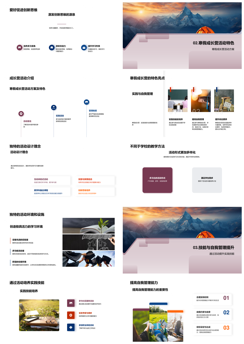 这是一张假期兴趣技能实践安全露营成长营PPT模板,包含假期、兴趣、技能、实践、安全、露营、成长营等主题内容,也可用作假期兴趣技能实践、兴趣技能实践安全、技能实践安全露营、实践安全露营成长营、假期兴趣技能、兴趣技能实践、技能实践安全、实践安全露营、安全露营成长营、假期兴趣、兴趣技能、技能实践、实践安全、安全露营、露营成长营等PPT场景使用。