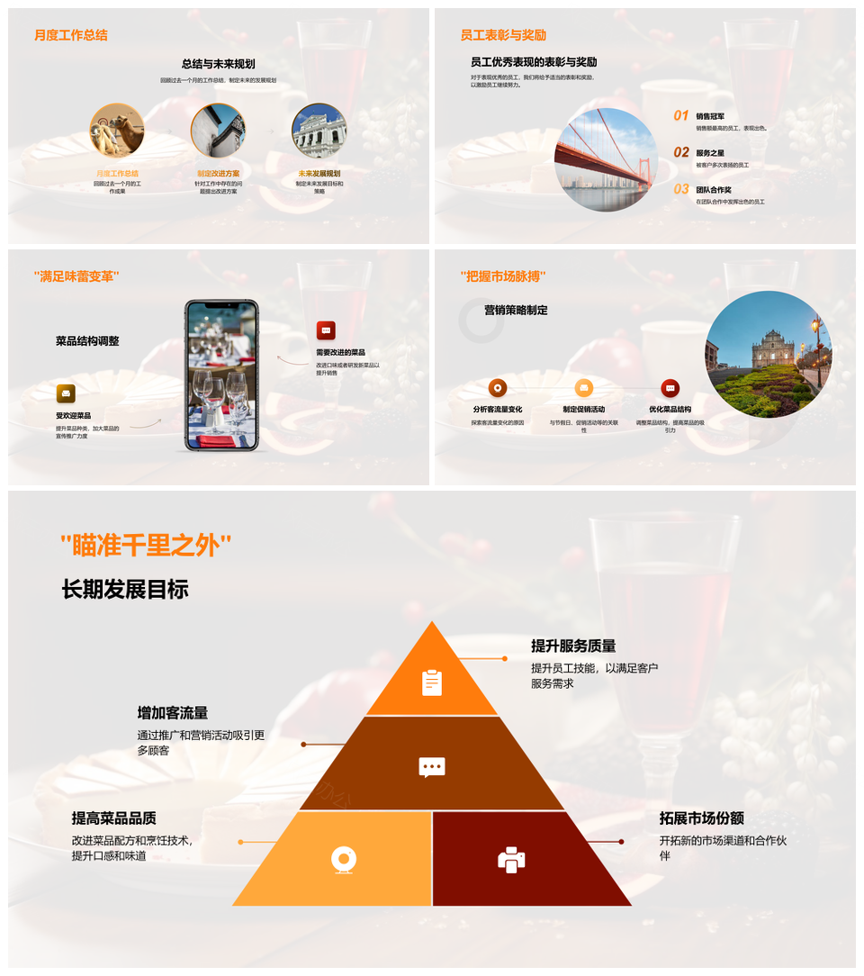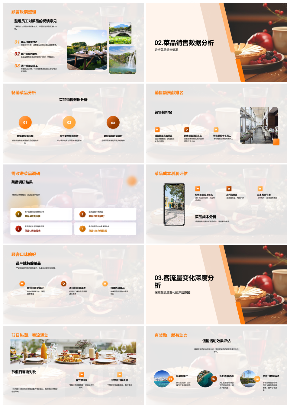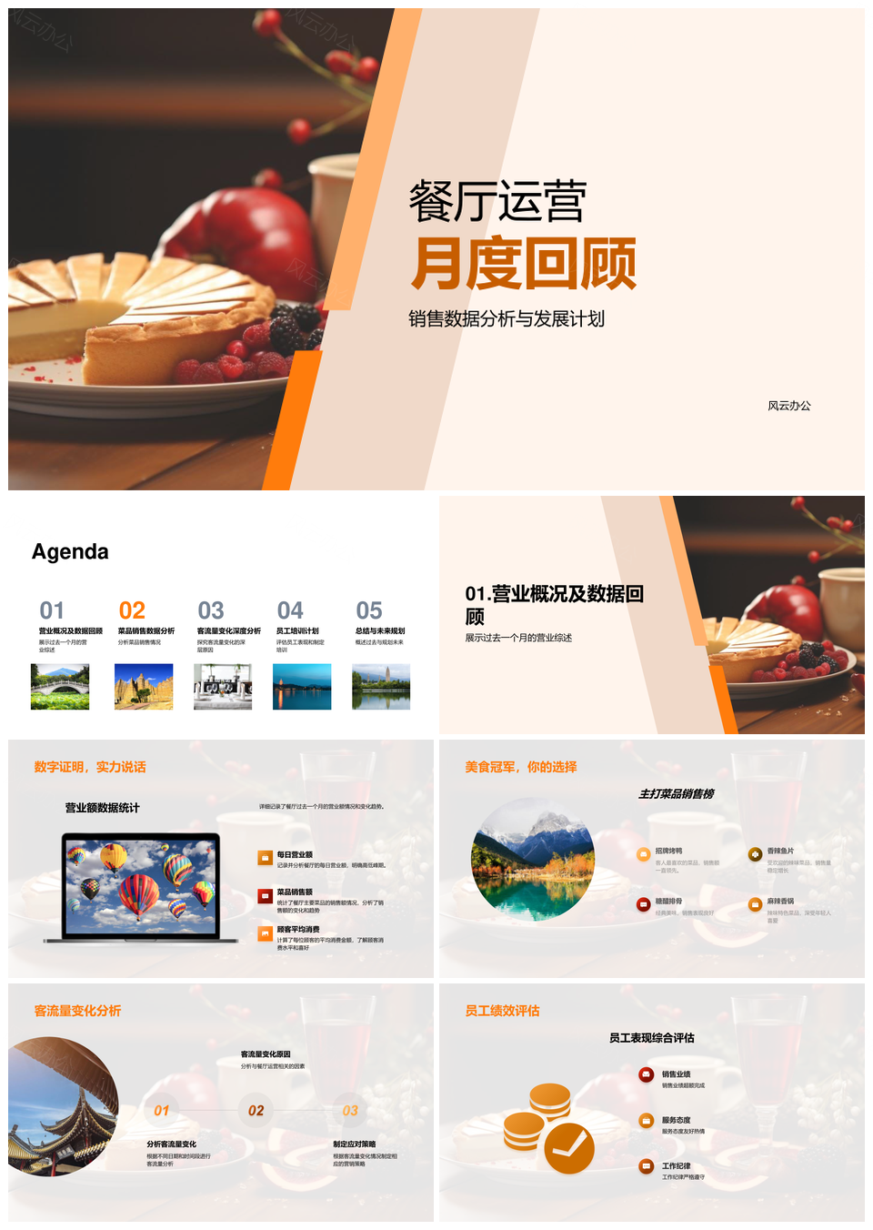 这是一张餐厅运营月销售数据客流量菜品员工发展计划PPT模板,包含餐厅、运营、月销售数据、客流量、菜品、员工、发展计划等主题内容,也可用作餐厅运营月销售数据、月销售数据客流量菜品、客流量菜品员工发展计划、运营月销售数据客流量、餐厅菜品员工发展计划、月销售数据客流量、客流量菜品员工、菜品员工发展计划、运营月销售数据、餐厅客流量菜品、餐厅员工发展计划、餐厅运营、月销售数据、客流量菜品、员工发展计划等PPT场景使用。 风云办公提供的餐厅运营月销售数据客流量菜品员工发展计划PPT模板,下载格式为pptx,一共33页,作品中文字及图均可以修改和编辑,图片更改请在作品中右键图片并更换,文字修改请直接点击文字进行修改。