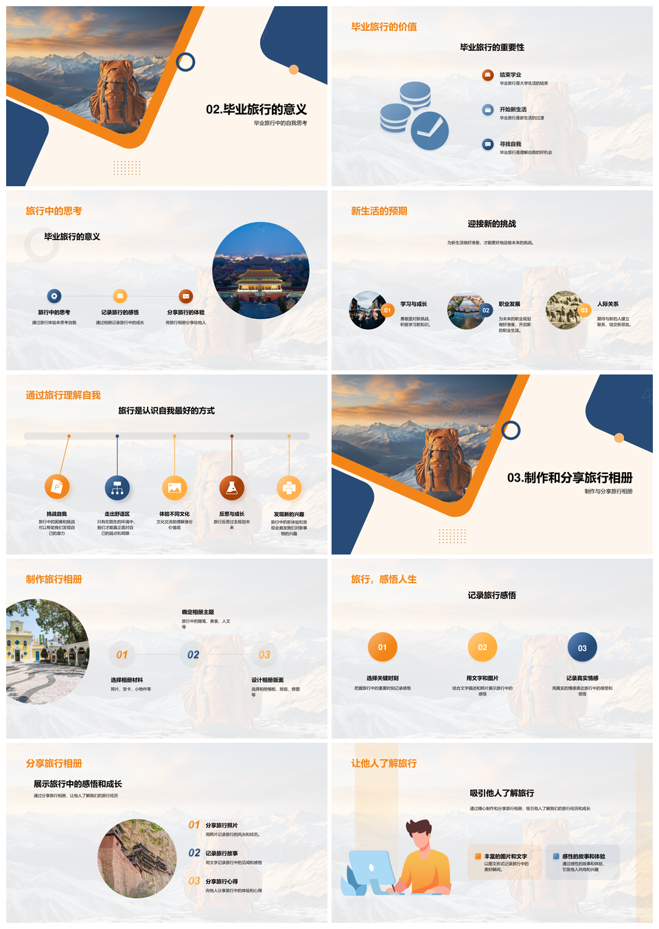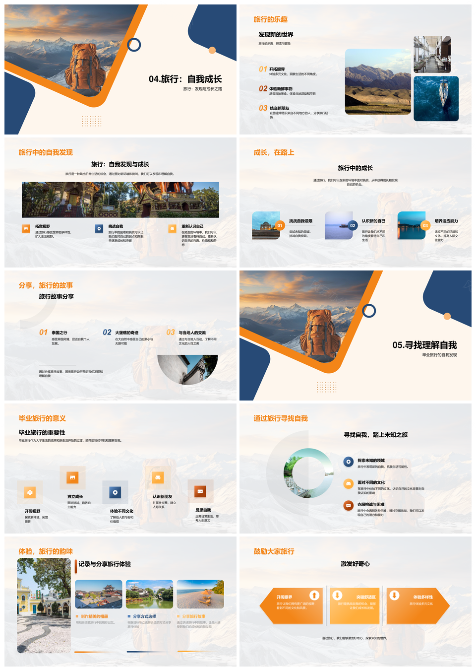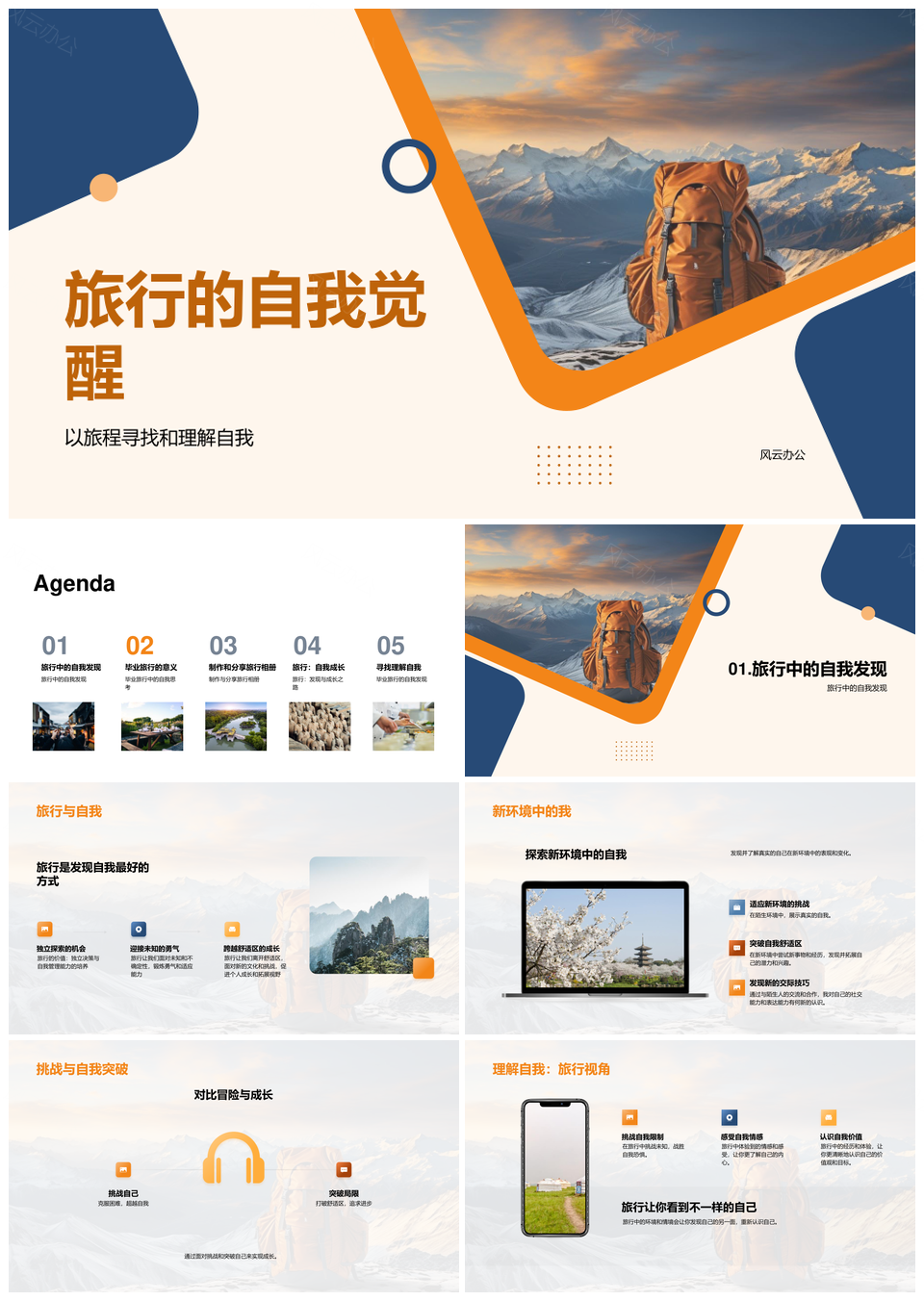 风云办公提供的背包旅行觉醒自我毕业故事分享PPT模板,下载格式为pptx,一共28页,作品中文字及图均可以修改和编辑,图片更改请在作品中右键图片并更换,文字修改请直接点击文字进行修改。