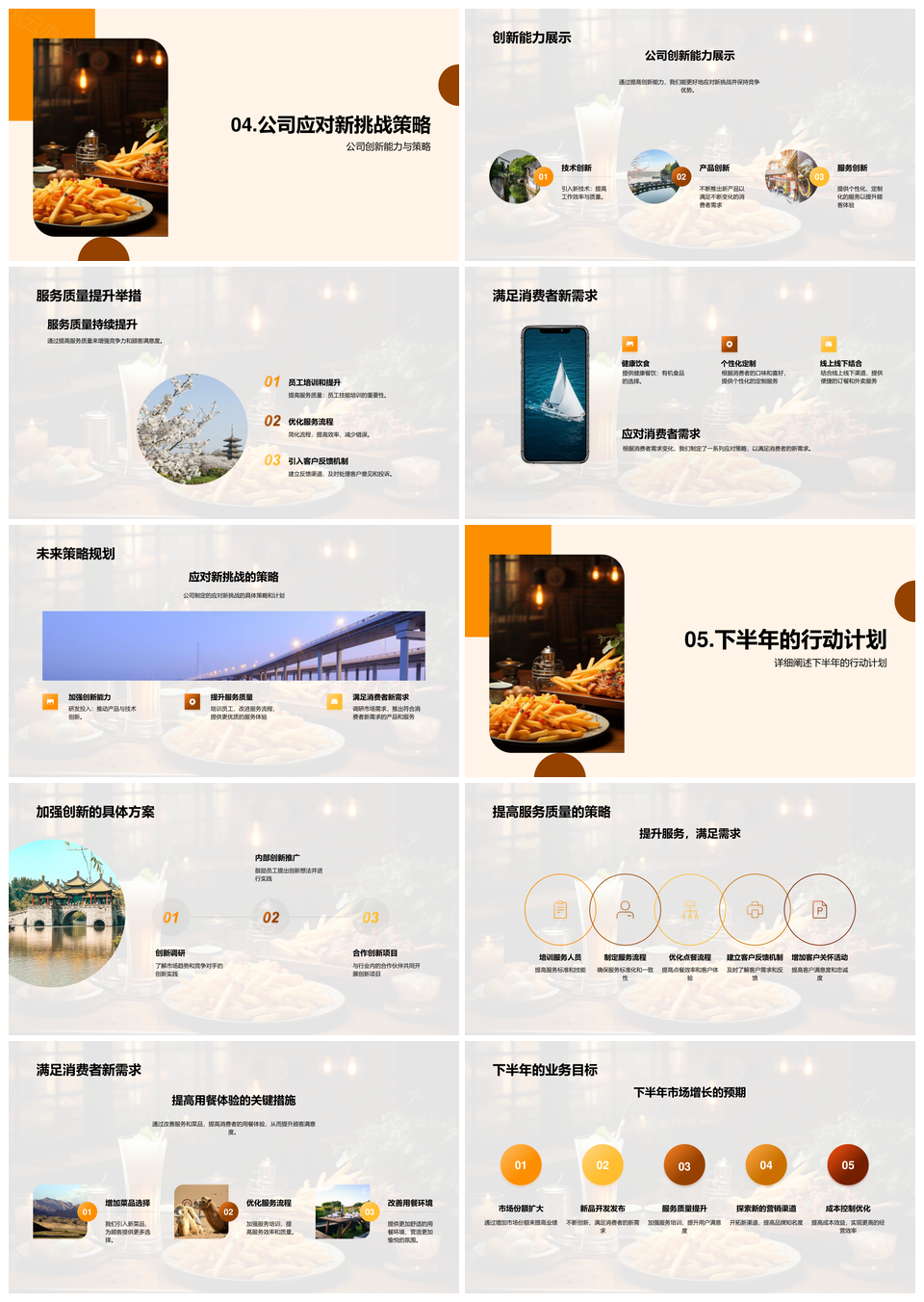 这款商务风PPT模板以白色与浅灰为主色调,搭配活力橙作为点睛之笔,既有专业质感又不失视觉张力。模块化版面通过清晰的逻辑层级与无衬线字体传递严谨感,分栏式设计让图文信息高效聚焦。图形元素采用极简线条与几何色块,配合低饱和度的渐变处理,平衡现代感与人文温度。内页通过留白比例与对齐规则构建呼吸感,数据图表、流程图示等商务场景均适配框架化设计,既能保障内容精准传达,也可灵活替换企业VI色系。职场提案、品牌分析等场景均可快速应用。
