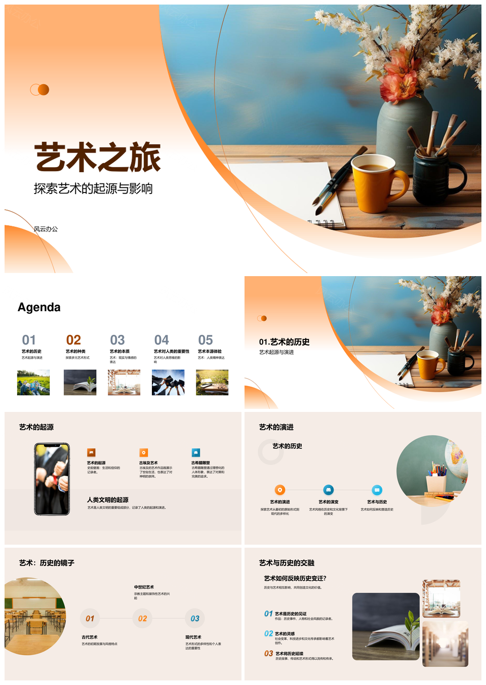 风云办公提供的艺术起源演进多元美学生活之旅PPT模板,下载格式为pptx,一共27页,作品中文字及图均可以修改和编辑,图片更改请在作品中右键图片并更换,文字修改请直接点击文字进行修改。