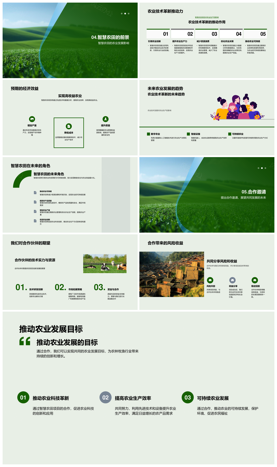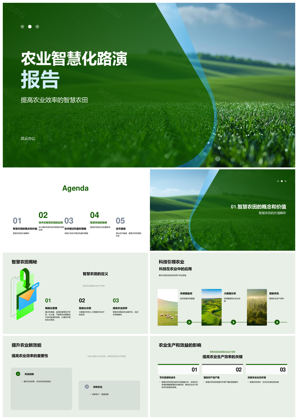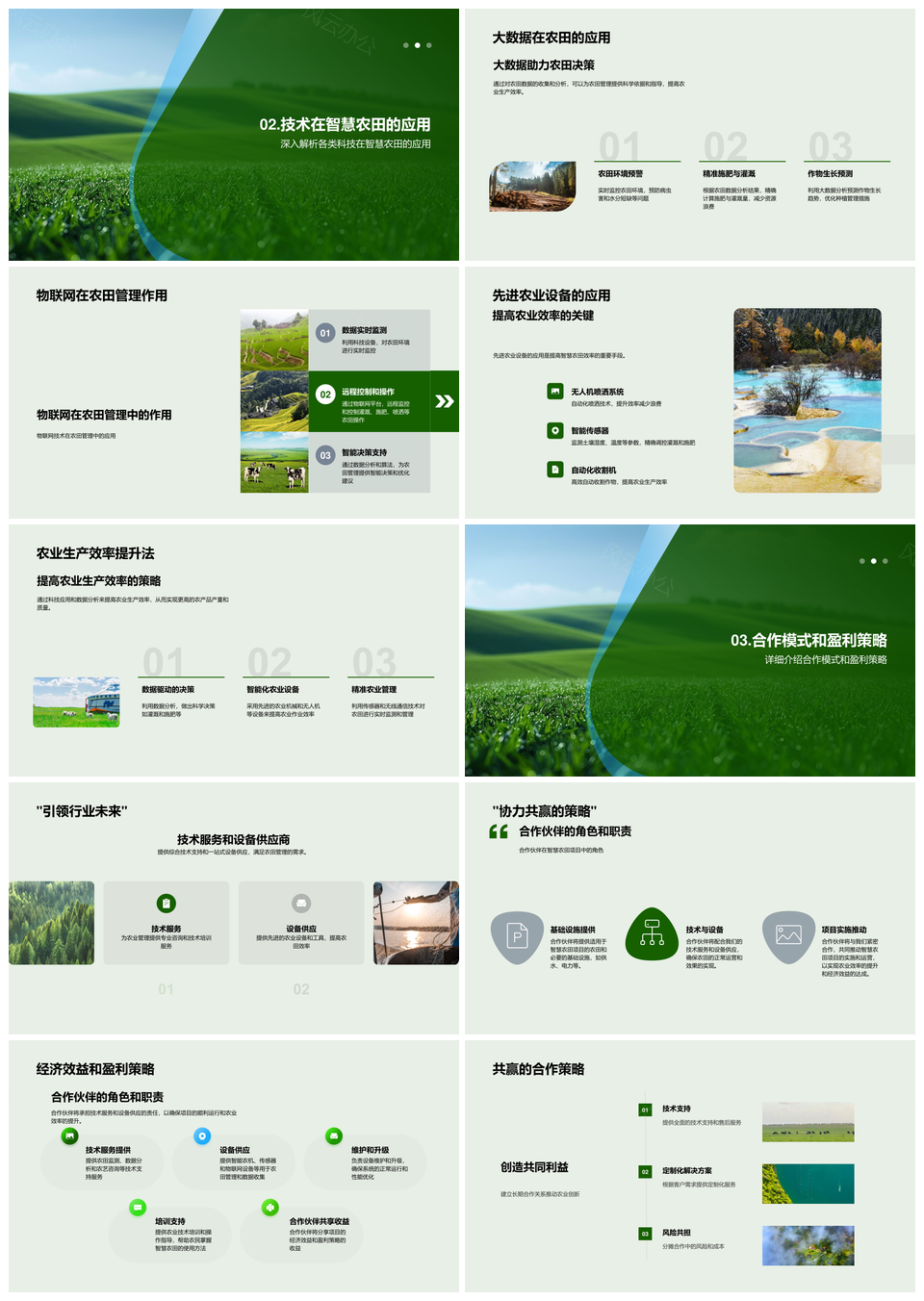 这是一张智慧农业增效合作盈利大数据物联网设备应用PPT模板,包含智慧农业、增效、合作、盈利、大数据、物联网、设备、应用等主题内容,也可用作智慧农业增效合作盈利、增效合作盈利大数据、合作盈利大数据物联网设备、盈利大数据物联网设备应用、大数据物联网设备应用增效、物联网设备应用增效合作、应用增效合作盈利、智慧农业增效合作、增效合作盈利、合作盈利大数据、盈利大数据物联网设备、大数据物联网设备应用、物联网设备应用增效、应用增效合作、智慧农业增效等PPT场景使用。 风云办公提供的智慧农业增效合作盈利大数据物联网设备应用PPT模板,下载格式为pptx,一共27页,作品中文字及图均可以修改和编辑,图片更改请在作品中右键图片并更换,文字修改请直接点击文字进行修改。