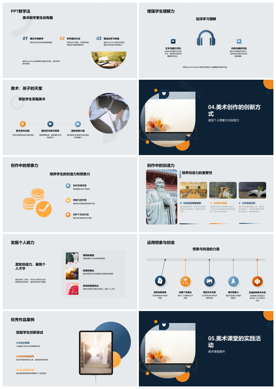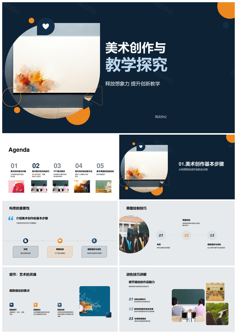 风云办公提供的初中美术创意教学与创作探究PPT模板,下载格式为pptx,一共33页,作品中文字及图均可以修改和编辑,图片更改请在作品中右键图片并更换,文字修改请直接点击文字进行修改。