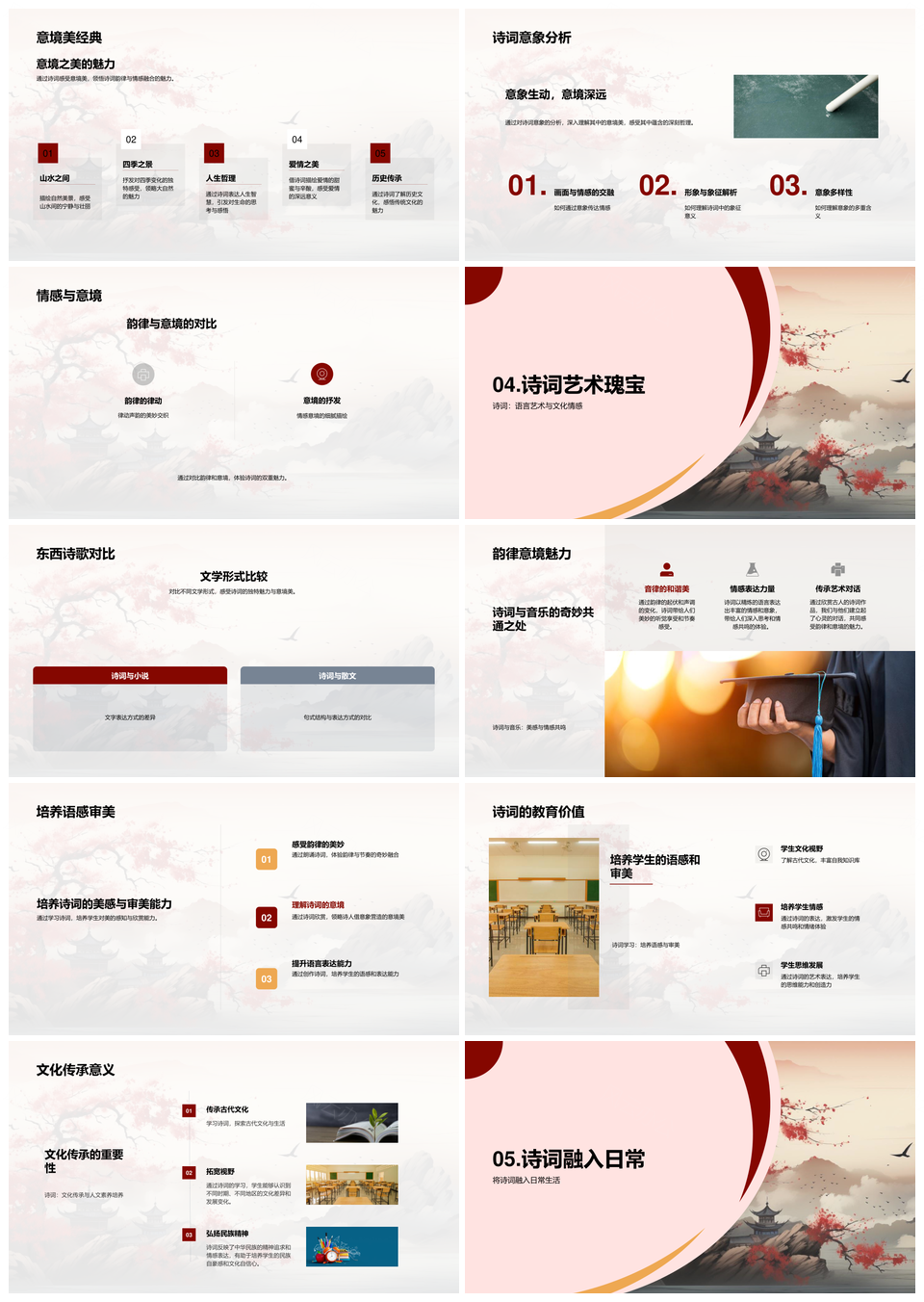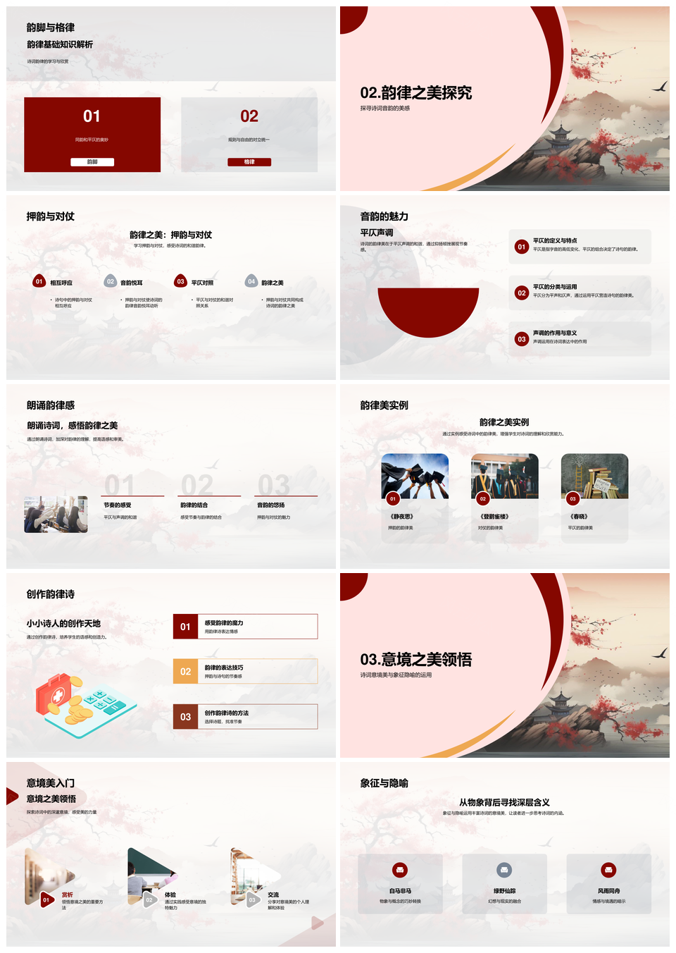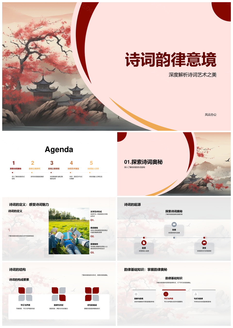 这是一张诗词韵律意境探源古卷技法美韵象征赏析PPT模板,包含诗词、韵律、意境、探源、古卷、技法、美韵、象征、赏析等主题内容,也可用作诗词韵律意境探源、韵律意境探源古卷、意境探源古卷技法、探源古卷技法美韵、古卷技法美韵象征、技法美韵象征赏析、诗词韵律意境、韵律意境探源、意境探源古卷、探源古卷技法、古卷技法美韵、技法美韵象征、诗词韵律、韵律意境、意境探源等PPT场景使用。 风云办公提供的诗词韵律意境探源古卷技法美韵象征赏析PPT模板,下载格式为pptx,一共33页,作品中文字及图均可以修改和编辑,图片更改请在作品中右键图片并更换,文字修改请直接点击文字进行修改。