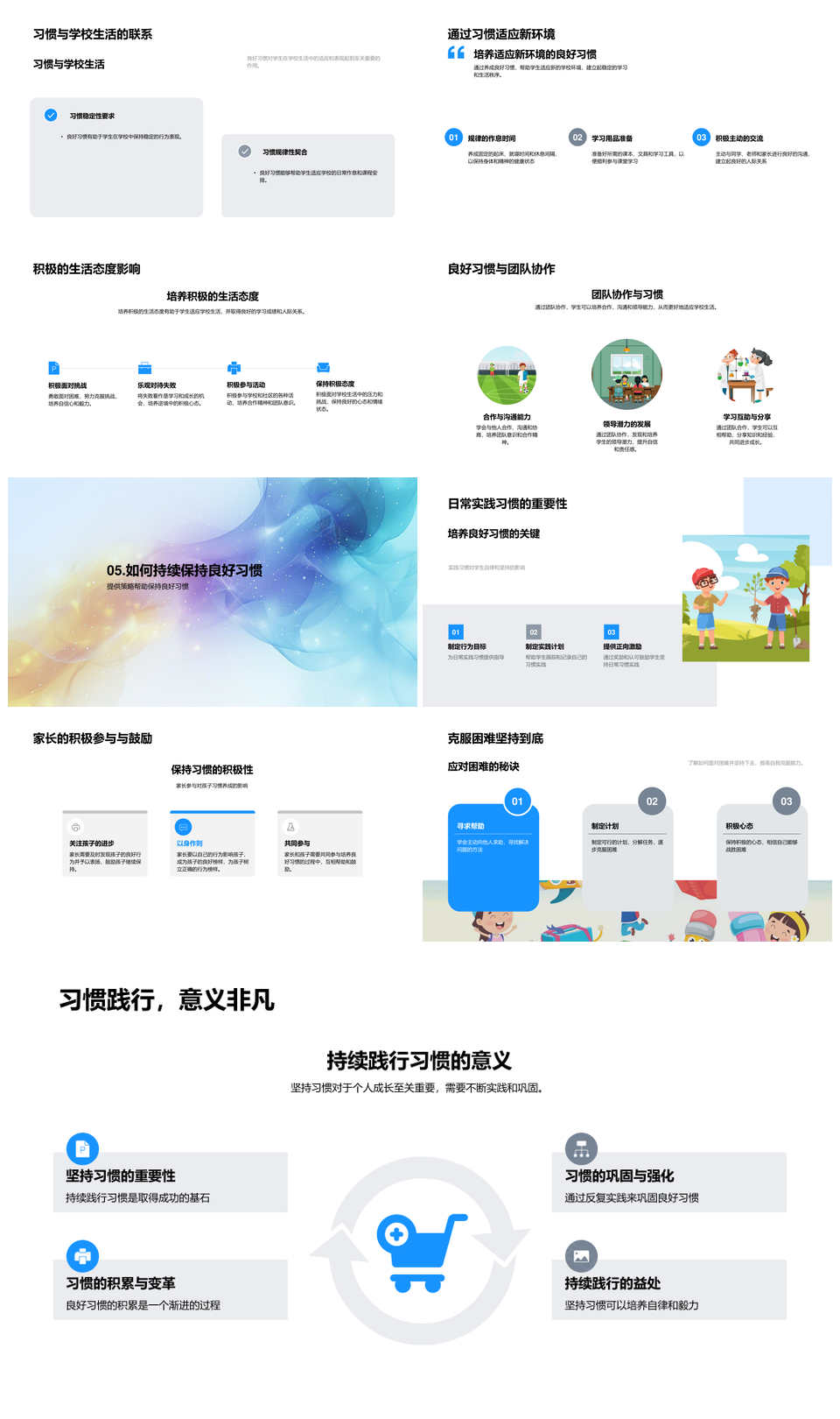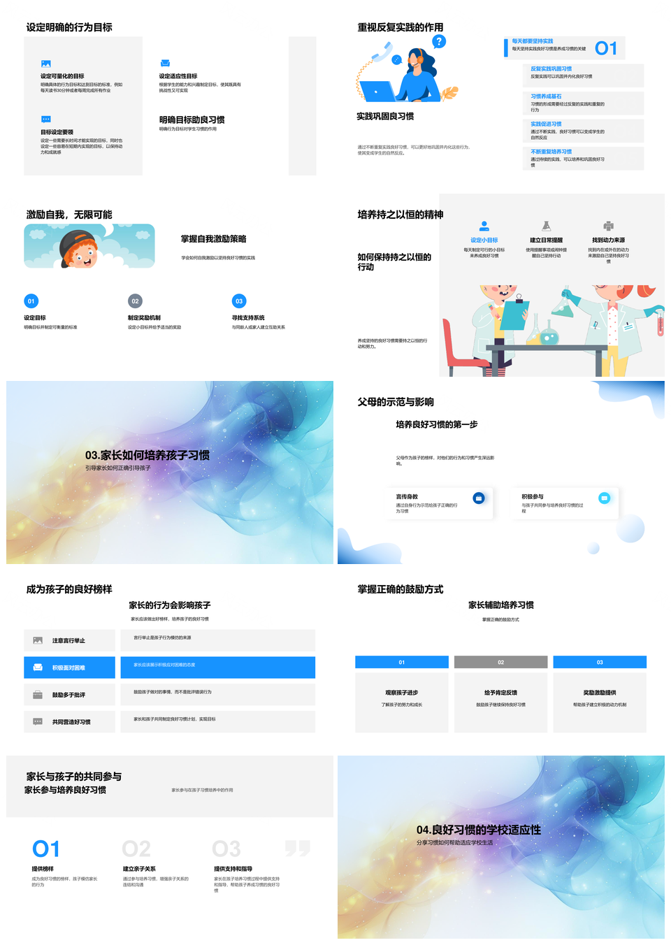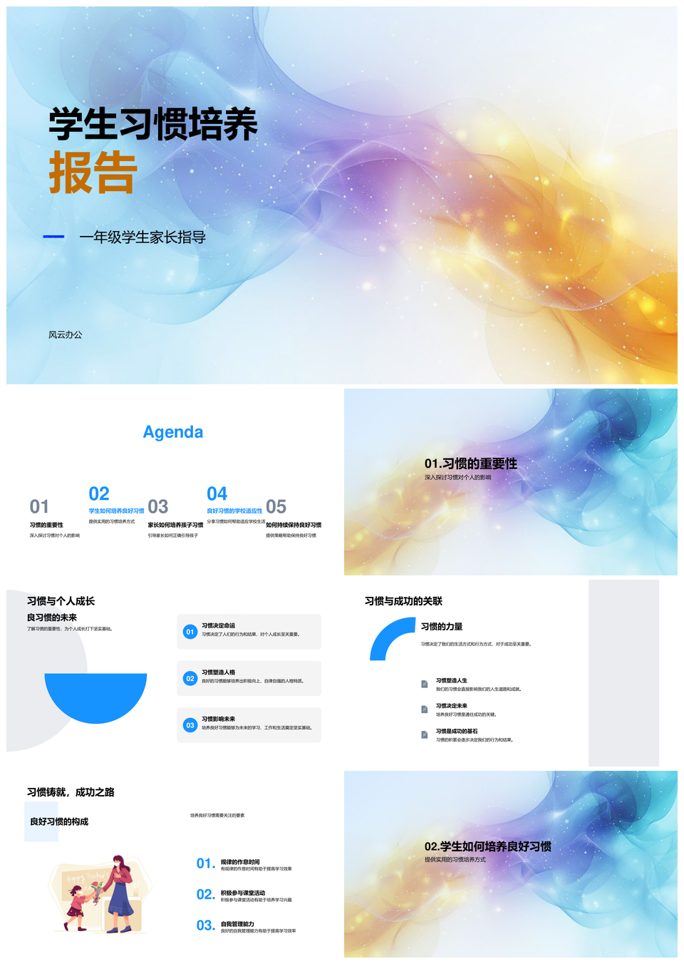 风云办公提供的家校共育一年级生习惯培养与激励引导PPT模板,下载格式为pptx,一共27页,作品中文字及图均可以修改和编辑,图片更改请在作品中右键图片并更换,文字修改请直接点击文字进行修改。