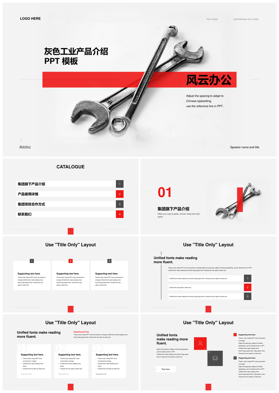 灰红工业工具维修维护产品设计案例展示PPT模板推荐