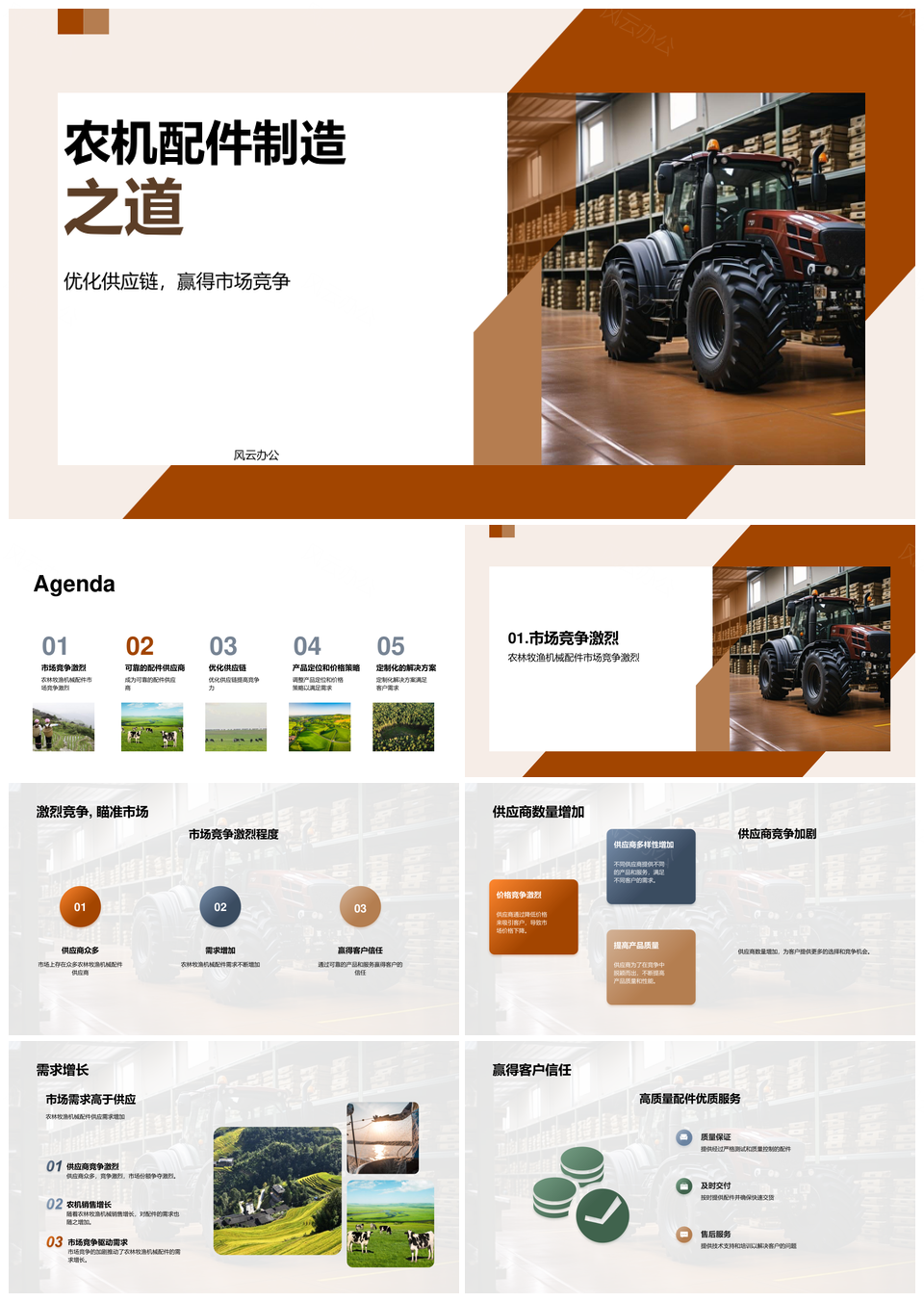 这是一张农机拖拉机配件可靠供应商诚信合作赢市场PPT模板,包含农机、拖拉机、配件、可靠、供应商、诚信合作、市场等主题内容,也可用作农机拖拉机配件可靠供应商、拖拉机配件可靠供应商诚信、配件可靠供应商诚信合作、可靠供应商诚信合作赢市场、农机拖拉机配件可靠、拖拉机配件可靠供应商、配件可靠供应商诚信、可靠供应商诚信合作、供应商诚信合作赢市场、农机拖拉机配件、拖拉机配件可靠、可靠供应商诚信、诚信合作赢市场、农机配件可靠、可靠供应商、诚信合作等PPT场景使用。 风云办公提供的农机拖拉机配件可靠供应商诚信合作赢市场PPT模板,下载格式为pptx,一共21页,作品中文字及图均可以修改和编辑,图片更改请在作品中右键图片并更换,文字修改请直接点击文字进行修改。