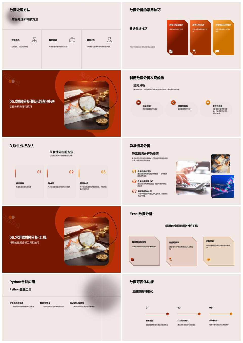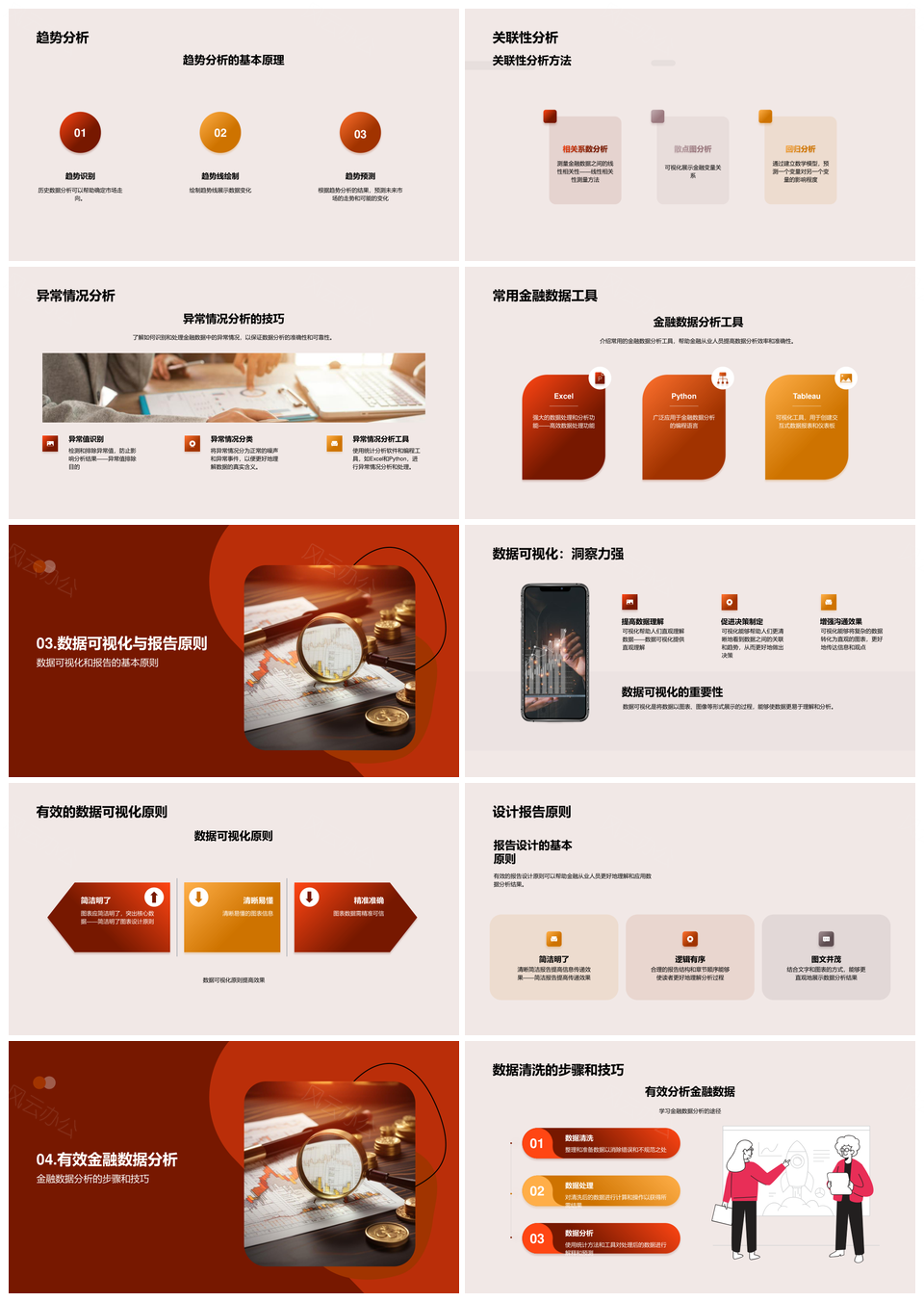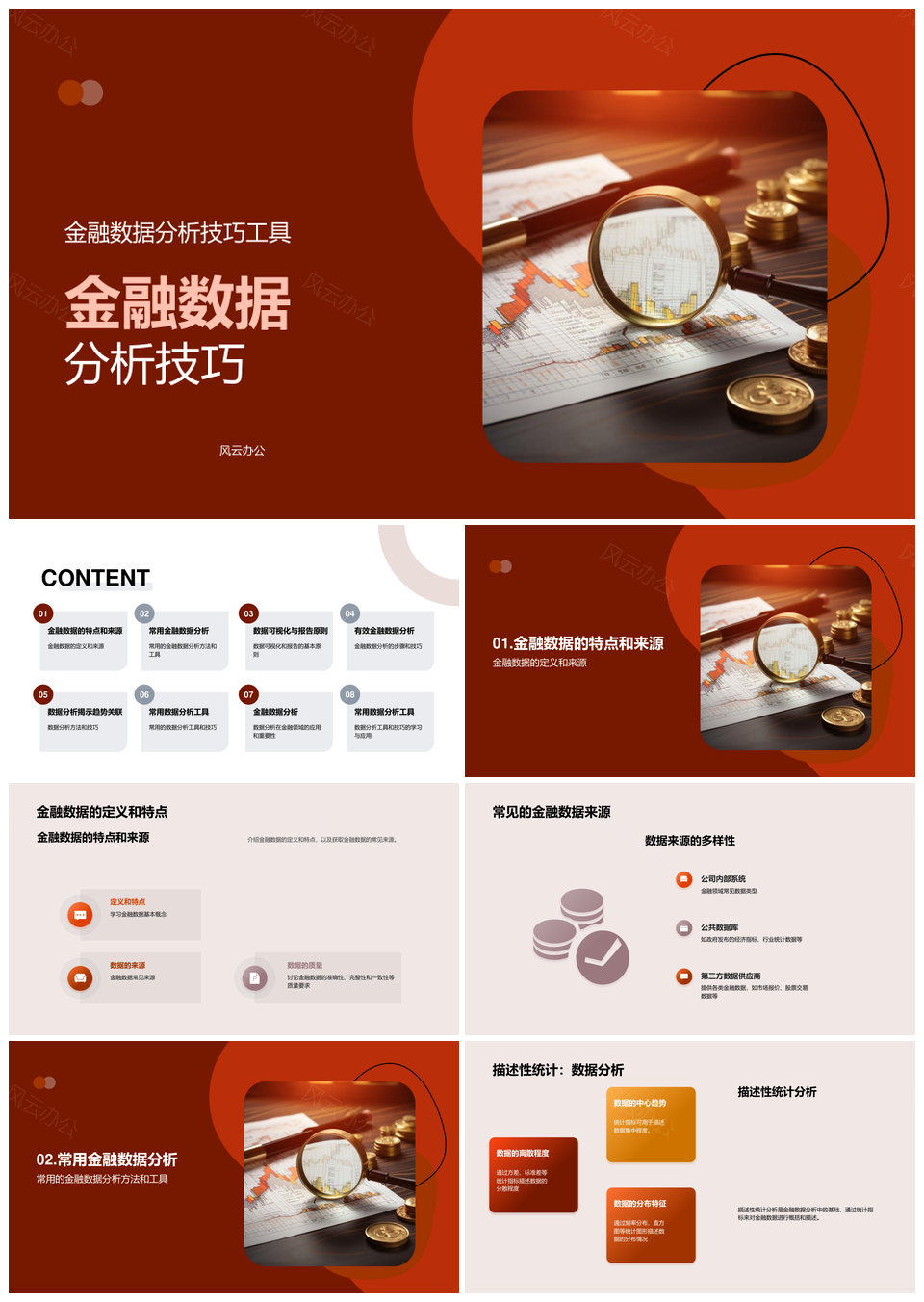 风云办公提供的金融数据分析统计技巧工具教学课件,下载格式为pptx,一共38页,作品中文字及图均可以修改和编辑,图片更改请在作品中右键图片并更换,文字修改请直接点击文字进行修改。