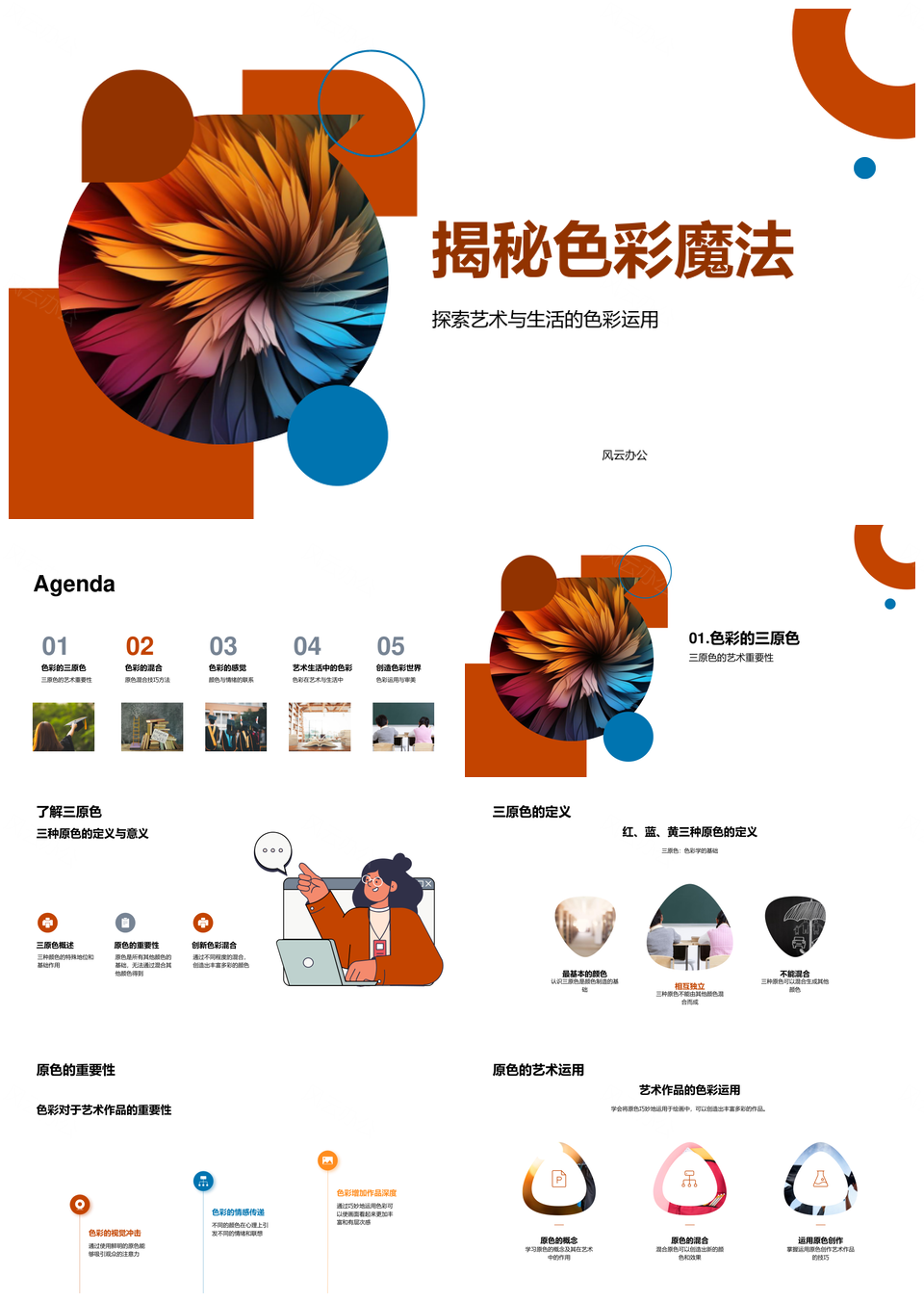 风云办公提供的色彩魔法三原色混合与情绪审美解析PPT模板,下载格式为pptx,一共28页,作品中文字及图均可以修改和编辑,图片更改请在作品中右键图片并更换,文字修改请直接点击文字进行修改。
