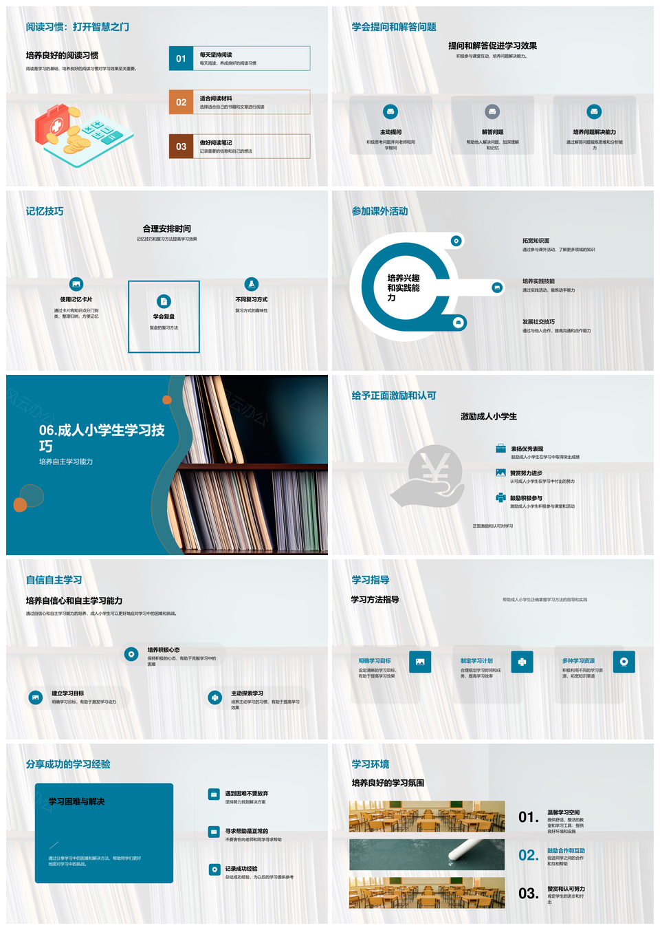 风云办公提供的成人小学生学习方法教师指导书籍PPT模板,下载格式为pptx,一共38页,作品中文字及图均可以修改和编辑,图片更改请在作品中右键图片并更换,文字修改请直接点击文字进行修改。