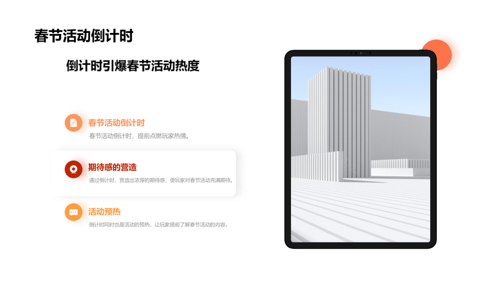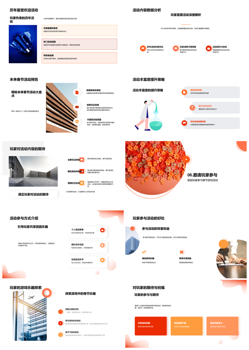 这是一张春节游戏活动回顾邀组队共庆灯笼消费分析PPT模板,包含春节、游戏、活动、回顾、邀、组队、共庆、灯笼、消费、分析等主题内容,也可用作春节游戏活动回顾、春节游戏活动、游戏活动回顾、组队共庆灯笼、共庆灯笼消费、灯笼消费分析、春节游戏、游戏活动、活动回顾、组队共庆、共庆灯笼、灯笼消费、消费分析、春节活动回顾、回顾组队共庆等PPT场景使用。 风云办公提供的春节游戏活动回顾邀组队共庆灯笼消费分析PPT模板,下载格式为pptx,一共39页,作品中文字及图均可以修改和编辑,图片更改请在作品中右键图片并更换,文字修改请直接点击文字进行修改。