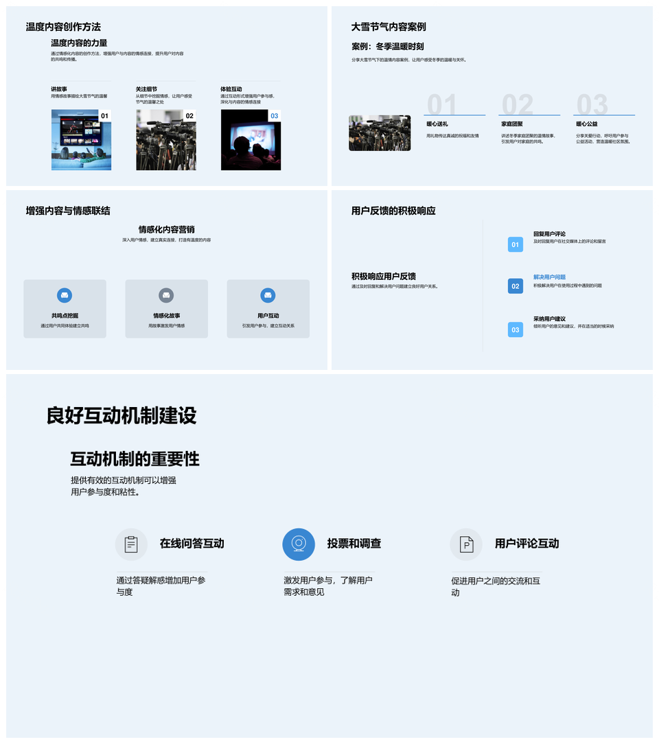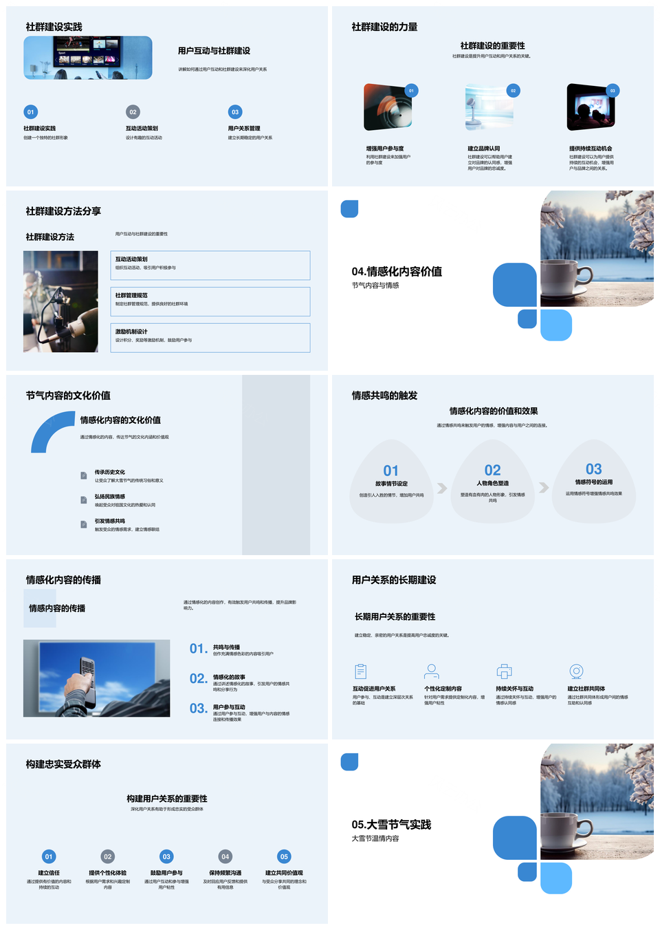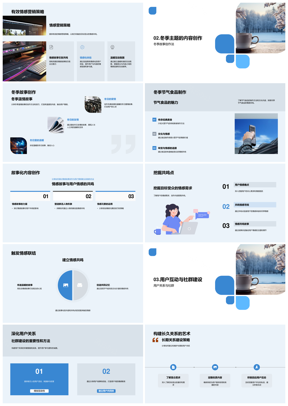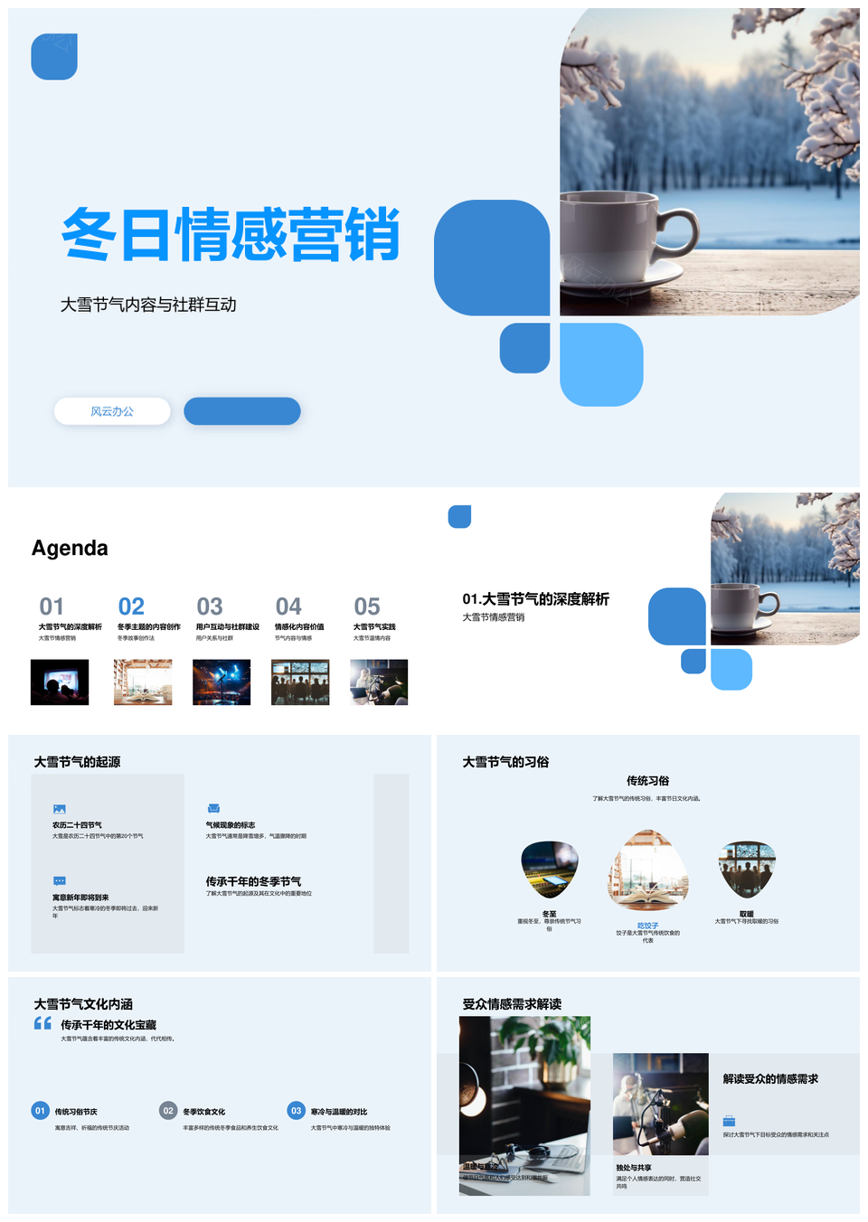 这是一张大雪节气社群互动情感营销故事食品创作策略PPT模板,包含大雪节气、社群互动、情感营销、故事、食品、创作策略等主题内容,也可用作大雪节气社群互动情感营销、大雪节气社群互动故事、大雪节气社群情感营销、大雪节气互动情感营销、社群互动情感营销故事、互动情感营销故事食品、情感营销故事食品创作、大雪节气社群互动、大雪节气情感营销、社群互动情感营销、互动情感营销故事、营销故事食品创作、节气互动情感营销、情感故事食品创作、故事食品创作策略等PPT场景使用。 风云办公提供的大雪节气社群互动情感营销故事食品创作策略PPT模板,下载格式为pptx,一共33页,作品中文字及图均可以修改和编辑,图片更改请在作品中右键图片并更换,文字修改请直接点击文字进行修改。