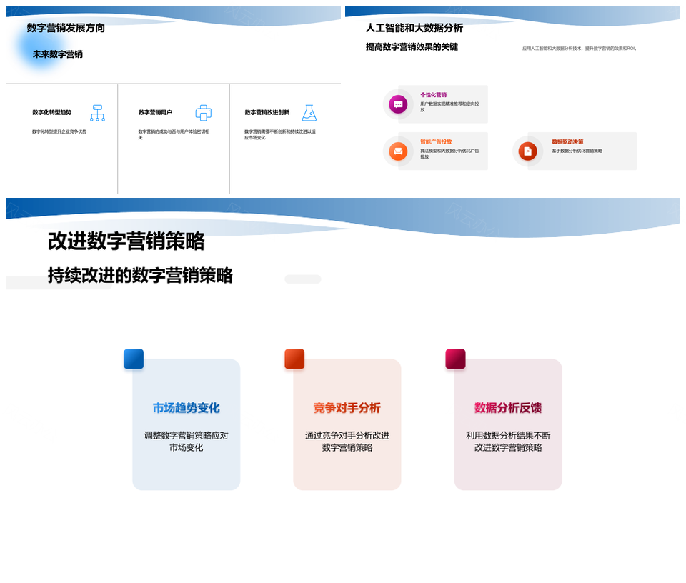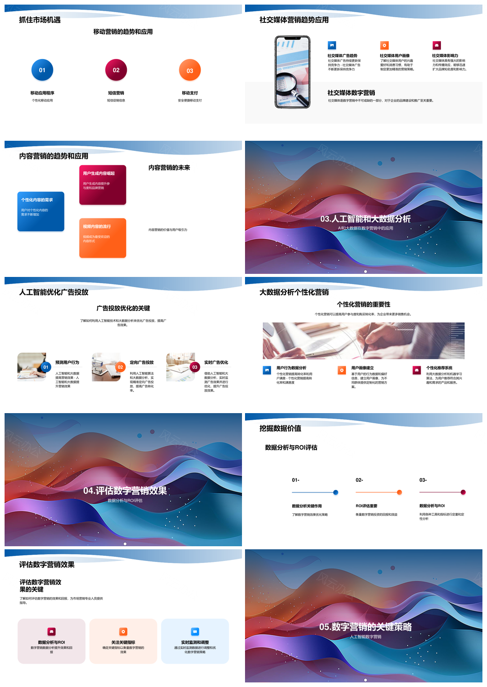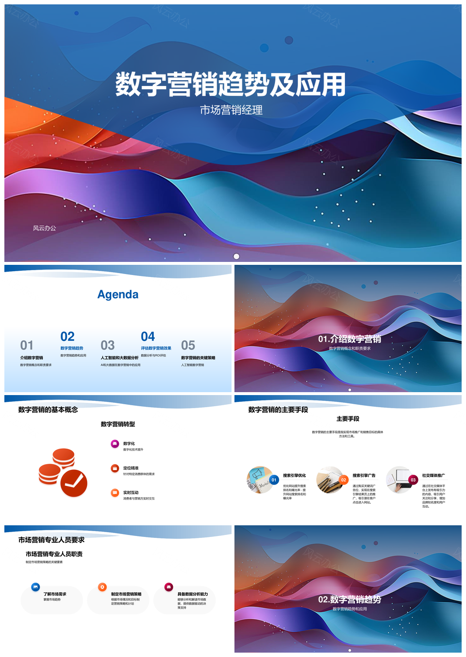 风云办公提供的数字营销趋势应用与营销经理职责解析PPT模板,下载格式为pptx,一共21页,作品中文字及图均可以修改和编辑,图片更改请在作品中右键图片并更换,文字修改请直接点击文字进行修改。