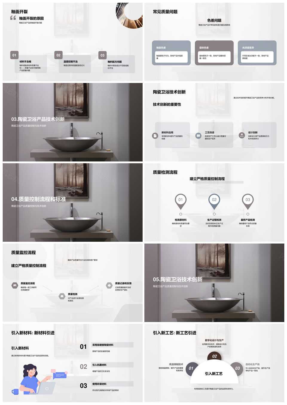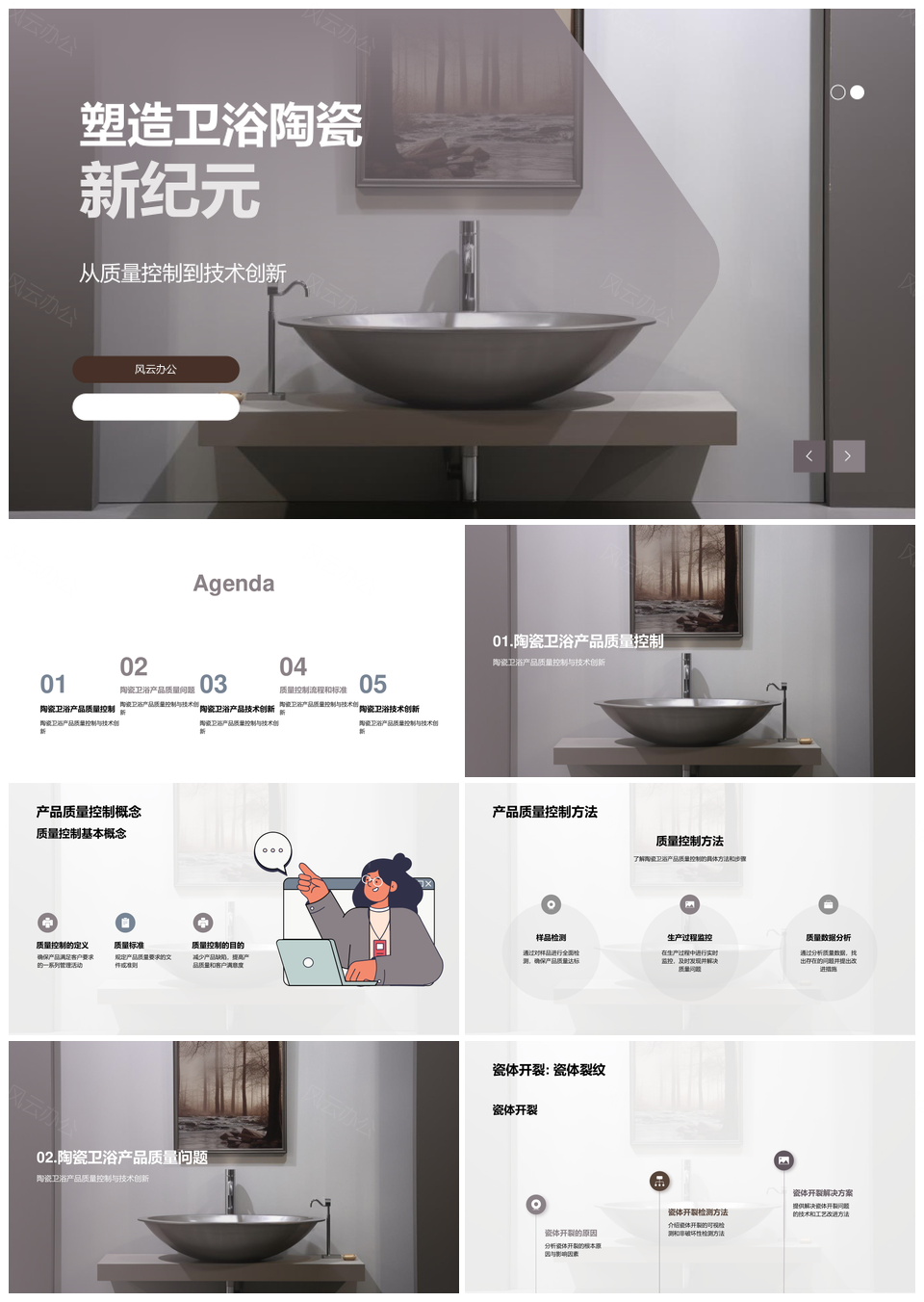 风云办公提供的卫浴陶瓷质控技术创新攻克瓷釉开裂PPT模板,下载格式为pptx,一共19页,作品中文字及图均可以修改和编辑,图片更改请在作品中右键图片并更换,文字修改请直接点击文字进行修改。