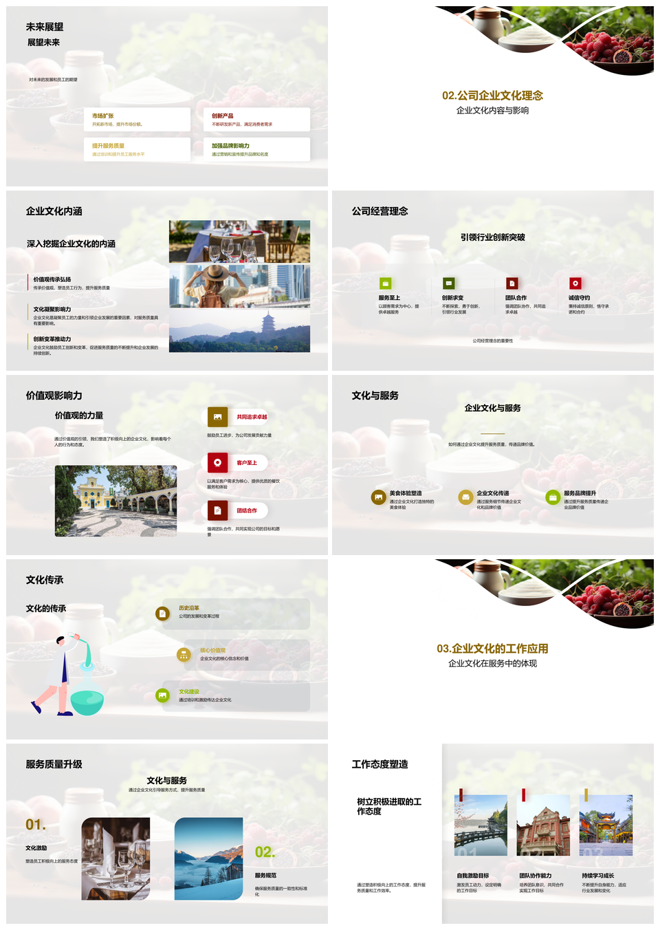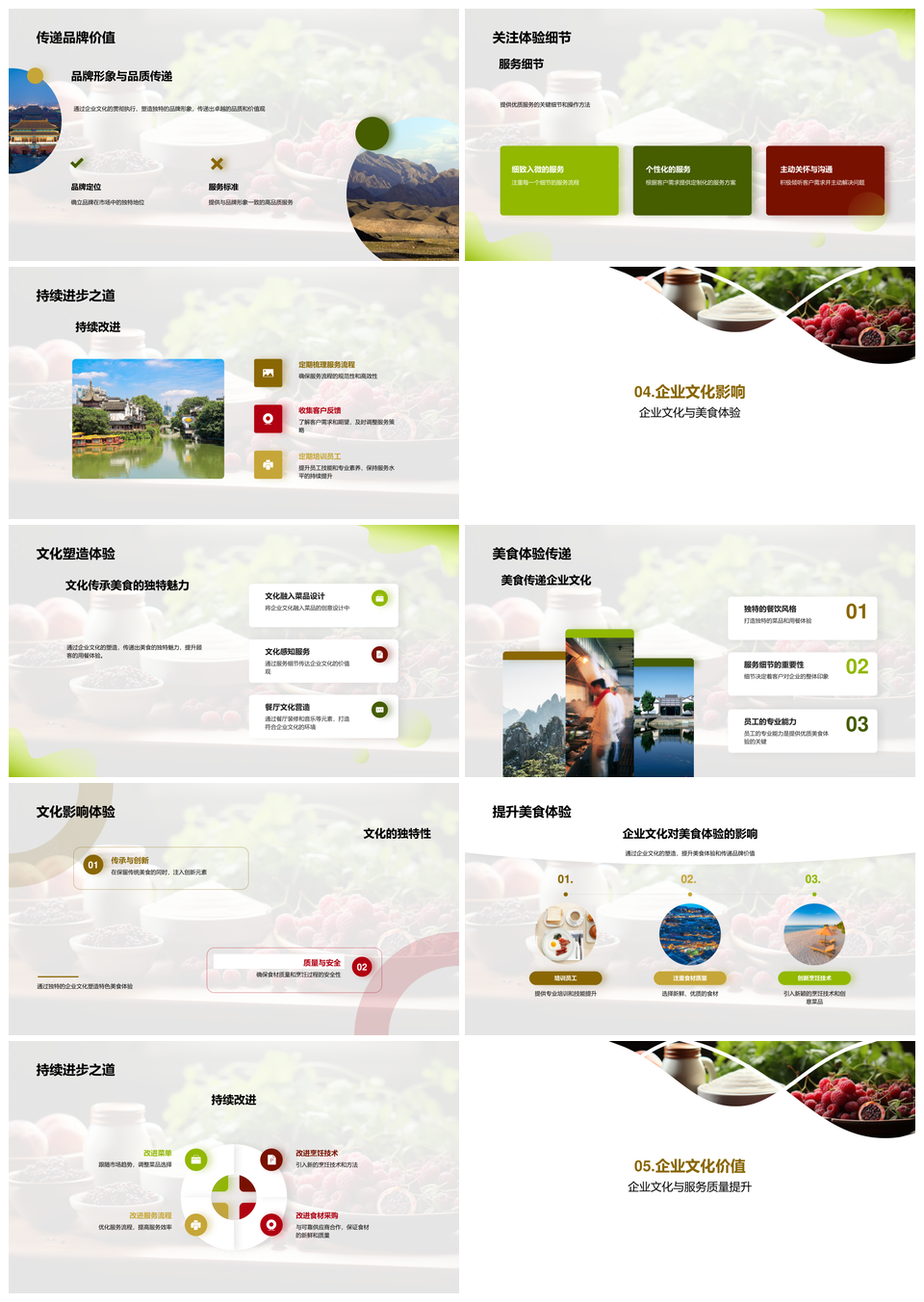 风云办公提供的企业文化优服务铸品牌领航美食PPT模板,下载格式为pptx,一共33页,作品中文字及图均可以修改和编辑,图片更改请在作品中右键图片并更换,文字修改请直接点击文字进行修改。
