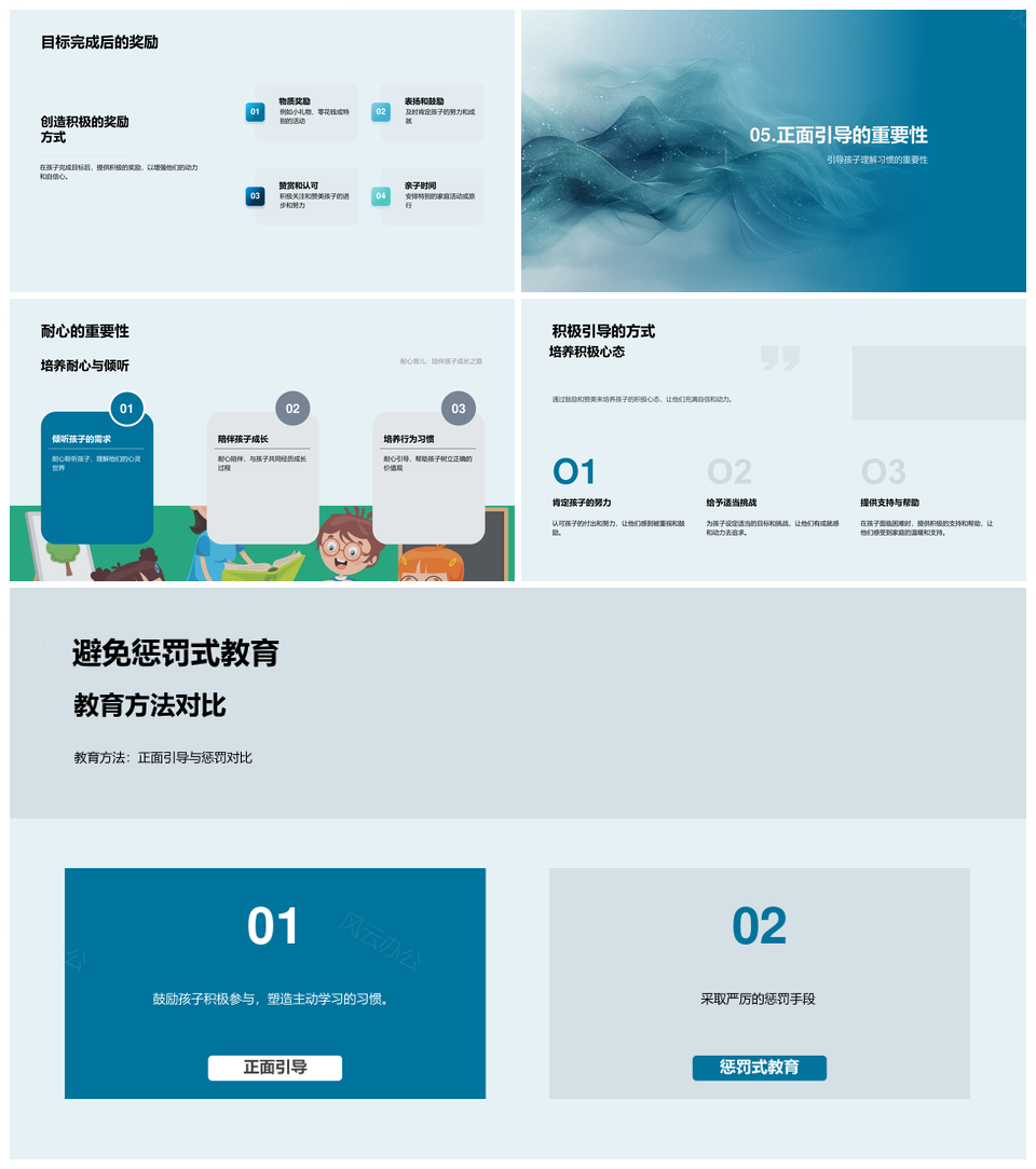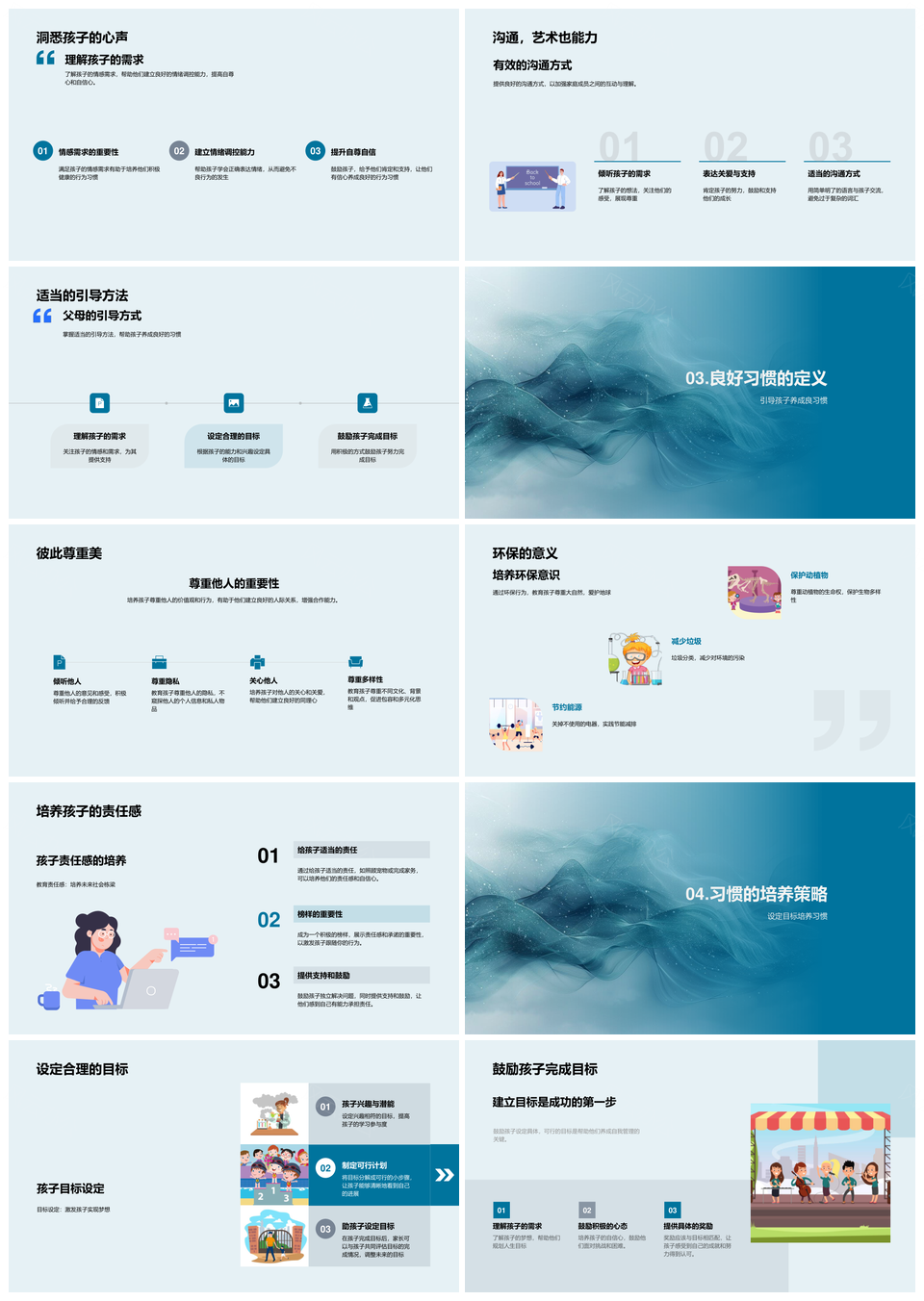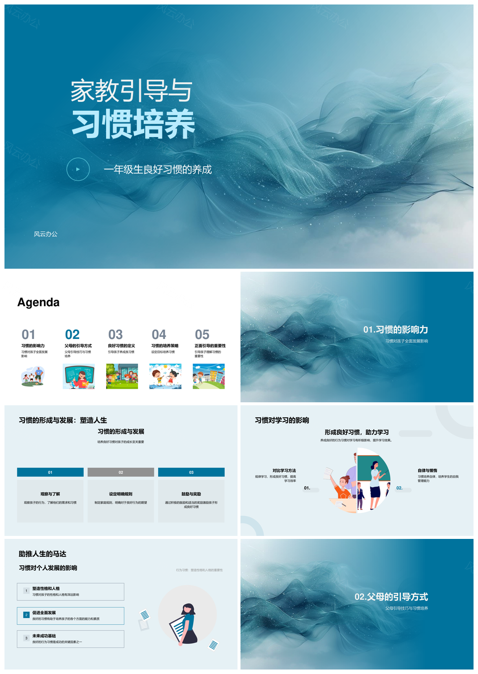 风云办公提供的家教引导一年级生良好习惯培养PPT模板,下载格式为pptx,一共23页,作品中文字及图均可以修改和编辑,图片更改请在作品中右键图片并更换,文字修改请直接点击文字进行修改。