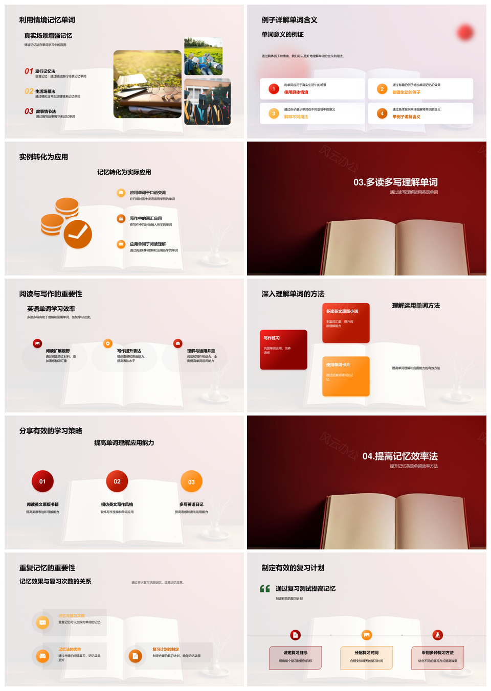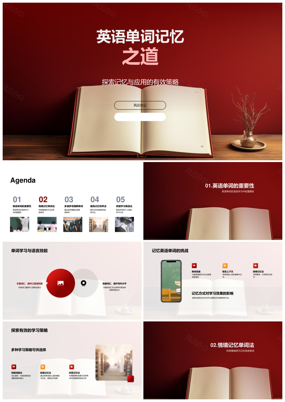 风云办公提供的英语单词记忆策略情境读写应用测试PPT模板,下载格式为pptx,一共24页,作品中文字及图均可以修改和编辑,图片更改请在作品中右键图片并更换,文字修改请直接点击文字进行修改。