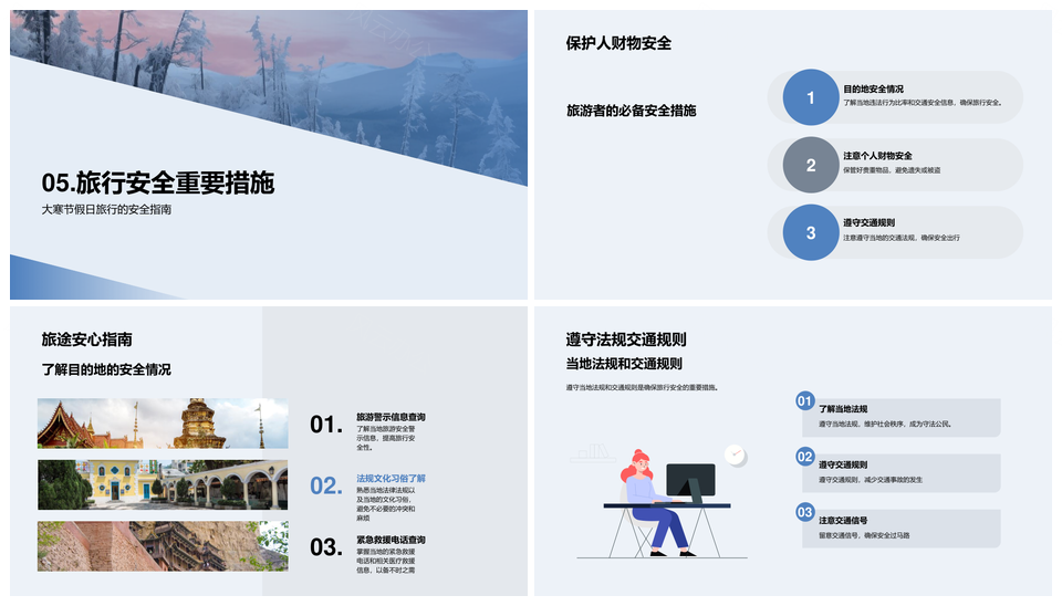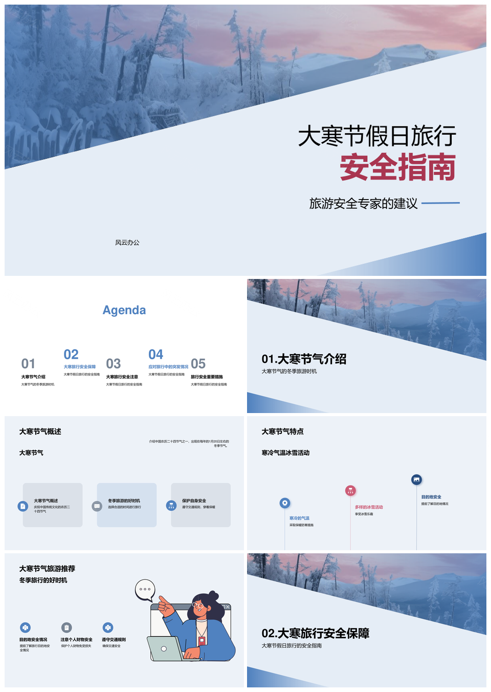 这是一张大寒冬季旅游安全指南PPT模板,包含大寒、冬季、旅游、安全、指南等主题内容,也可用作大寒冬季旅游安全指南、冬季旅游安全指南、大寒旅游安全指南、冬季旅游安全、旅游安全指南、大寒冬季旅游、冬季旅游指南、大寒安全指南、旅游安全、安全指南、冬季旅游、大寒旅游、冬季安全、旅游指南、大寒指南等PPT场景使用。 风云办公提供的大寒冬季旅游安全指南PPT模板,下载格式为pptx,一共22页,作品中文字及图均可以修改和编辑,图片更改请在作品中右键图片并更换,文字修改请直接点击文字进行修改。