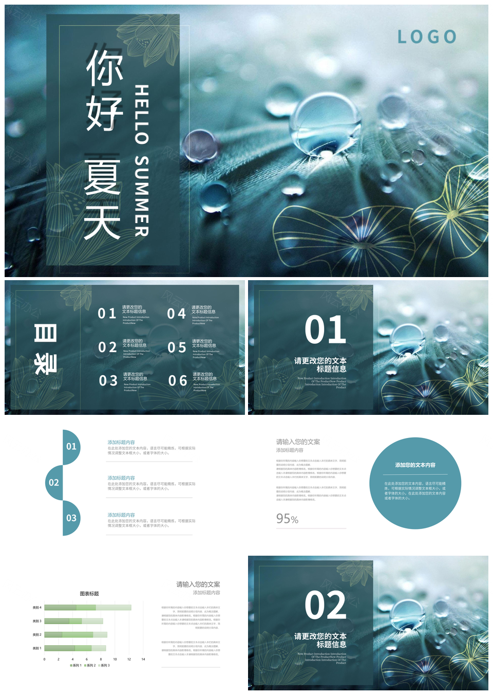 风云办公提供的蓝色小清新荷叶水珠夏季主题教育PPT模板,下载格式为pptx,一共25页,作品中文字及图均可以修改和编辑,图片更改请在作品中右键图片并更换,文字修改请直接点击文字进行修改。