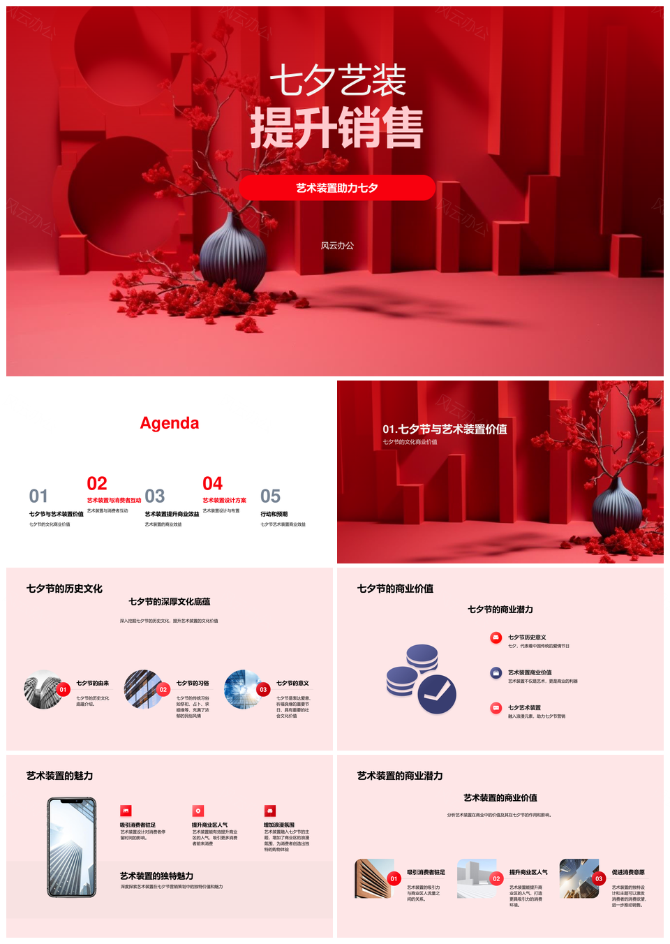 风云办公提供的七夕艺术装置助力商圈销售互动营销PPT模板,下载格式为pptx,一共33页,作品中文字及图均可以修改和编辑,图片更改请在作品中右键图片并更换,文字修改请直接点击文字进行修改。