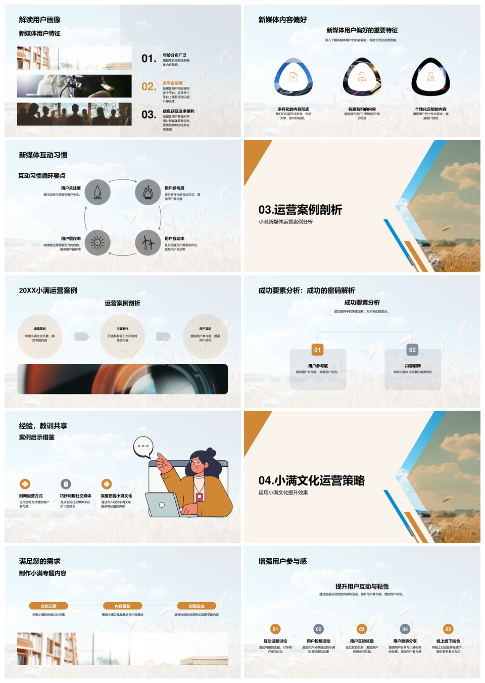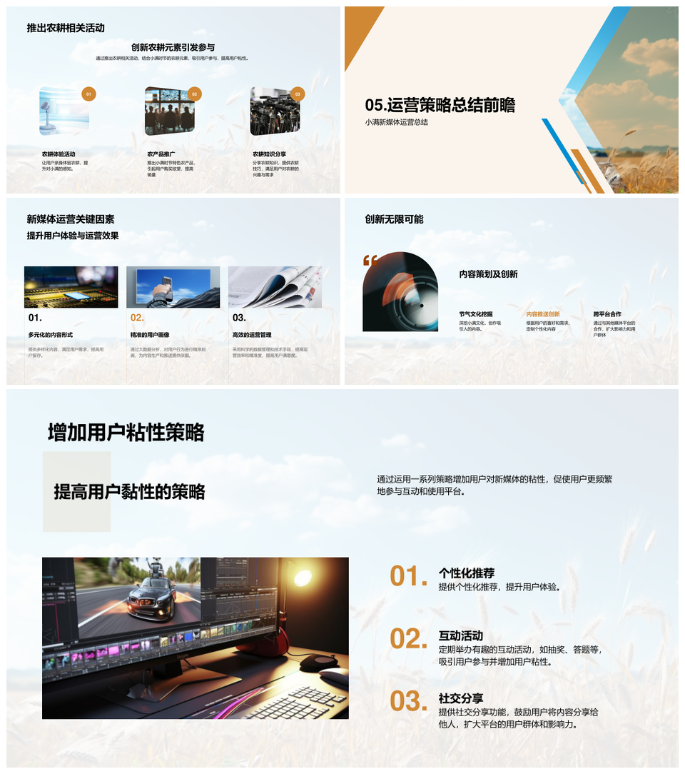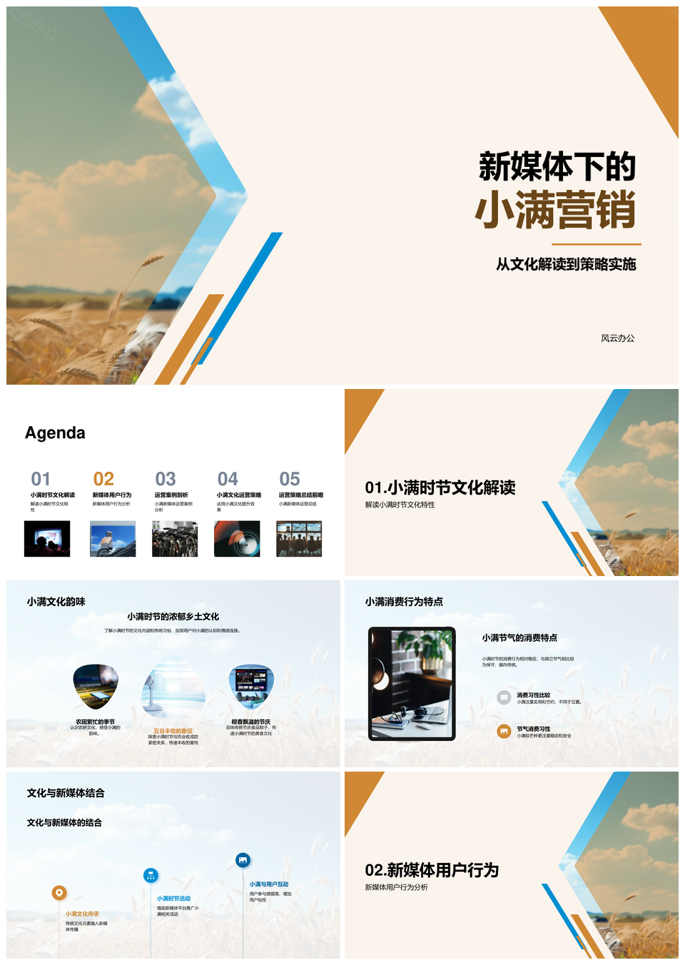 这是一张新媒体小满营销文化消费互动策划社区运营节气谷物PPT模板,包含新媒体、小满、营销、文化、消费、互动、策划、社区、运营、节气、谷物等主题内容,也可用作新媒体小满营销文化、小满营销文化消费、文化消费互动策划、互动策划社区运营、社区运营节气谷物、新媒体小满节气、小满营销互动策划、消费互动社区运营、策划社区节气谷物、新媒体文化消费、营销互动节气、策划运营谷物、小满节气谷物、社区节气、互动社区等PPT场景使用。 风云办公提供的新媒体小满营销文化消费互动策划社区运营节气谷物PPT模板,下载格式为pptx,一共23页,作品中文字及图均可以修改和编辑,图片更改请在作品中右键图片并更换,文字修改请直接点击文字进行修改。