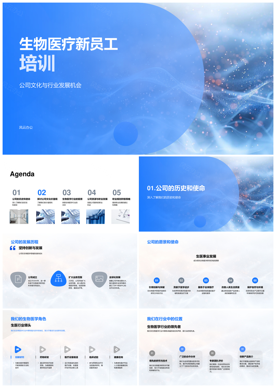 风云办公提供的生物医疗新员工文化职涯行业培训PPT模板,下载格式为pptx,一共27页,作品中文字及图均可以修改和编辑,图片更改请在作品中右键图片并更换,文字修改请直接点击文字进行修改。