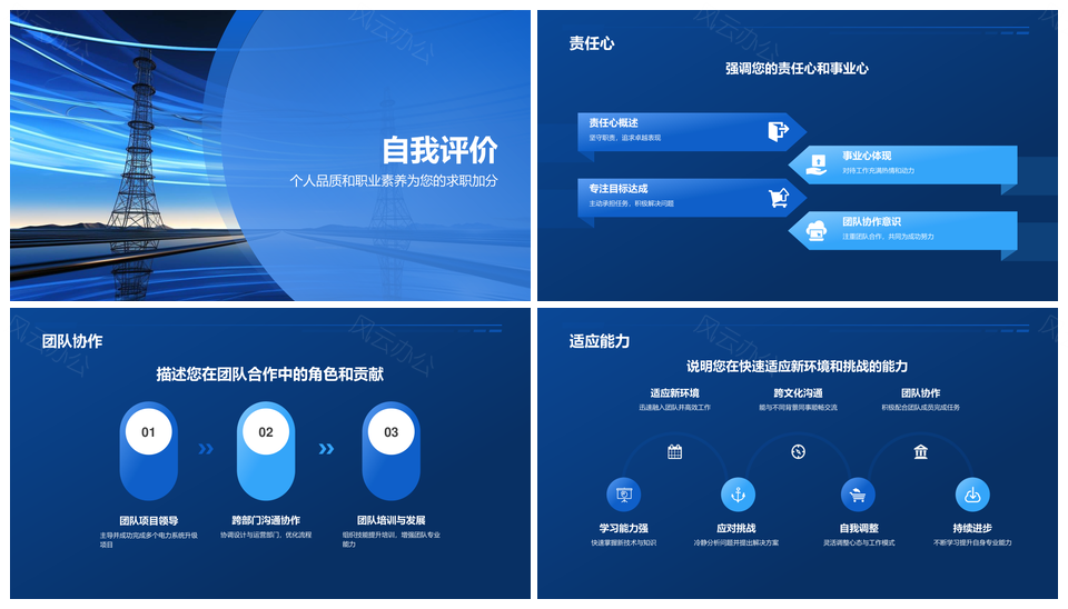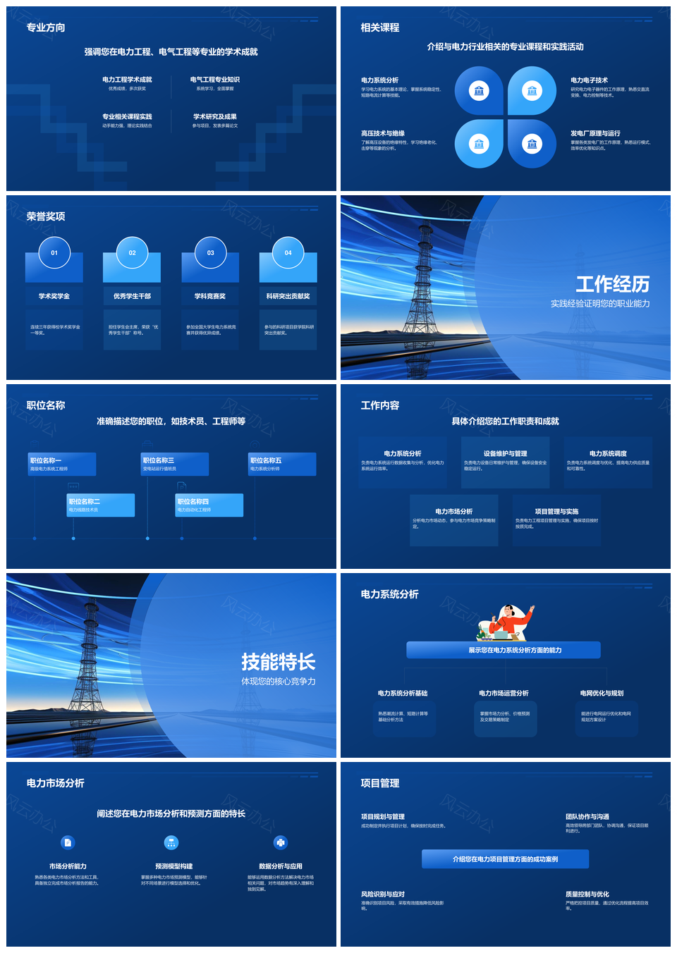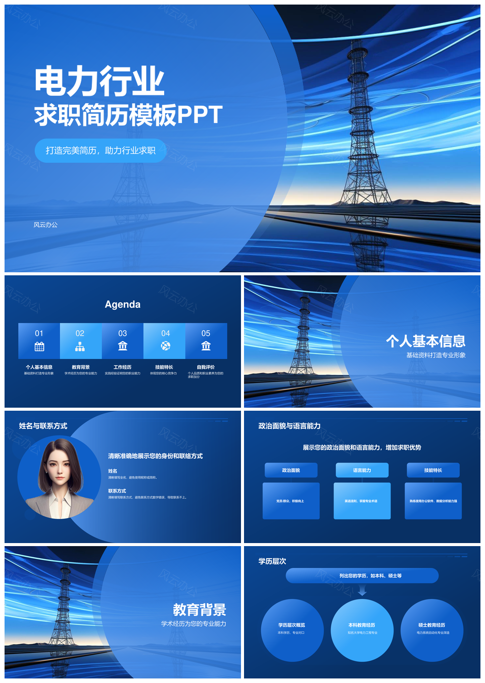风云办公提供的电力求职简历制作优化展示竞争岗位PPT模板,下载格式为pptx,一共22页,作品中文字及图均可以修改和编辑,图片更改请在作品中右键图片并更换,文字修改请直接点击文字进行修改。