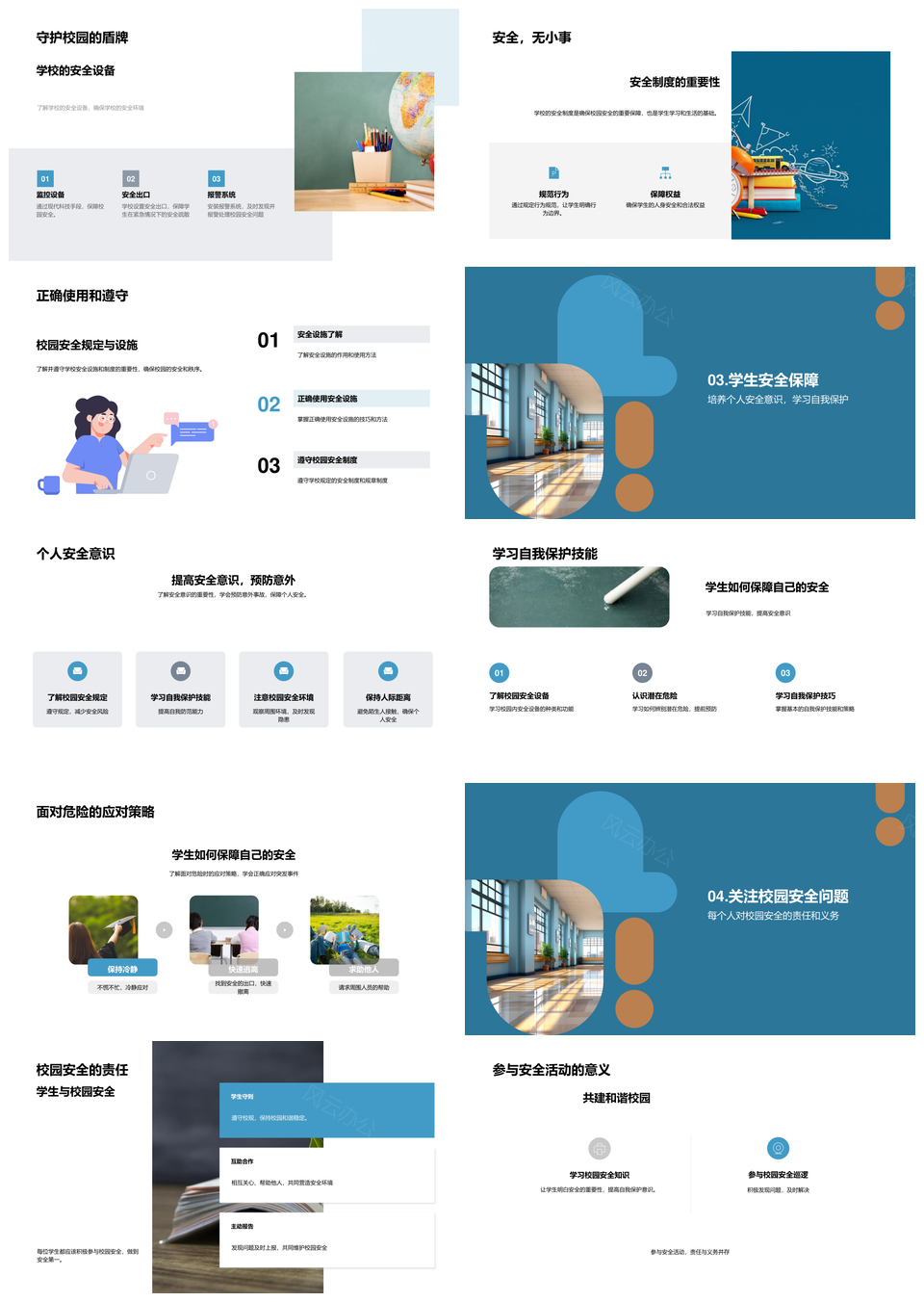 这是一张校园安全教育安全意识制度设备应对策略PPT模板,包含校园、安全教育、安全意识、制度、设备、应对策略等主题内容,也可用作校园安全教育安全意识制度、校园安全教育制度设备应对策略、安全教育安全意识制度设备、安全意识制度设备应对策略、校园安全教育制度设备、安全教育制度设备应对策略、校园安全制度设备应对策略、校园安全教育设备应对策略、安全教育安全意识应对策略、校园设备应对策略、校园安全教育、校园安全意识、安全教育制度、安全教育设备、设备应对策略等PPT场景使用。 风云办公提供的校园安全教育安全意识制度设备应对策略PPT模板,下载格式为pptx,一共23页,作品中文字及图均可以修改和编辑,图片更改请在作品中右键图片并更换,文字修改请直接点击文字进行修改。