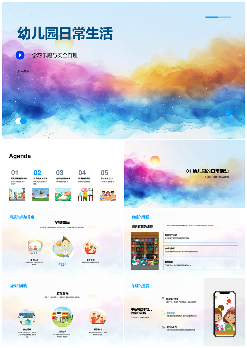风云办公提供的幼儿园乐学自理安全角色友情成长PPT模板,下载格式为pptx,一共33页,作品中文字及图均可以修改和编辑,图片更改请在作品中右键图片并更换,文字修改请直接点击文字进行修改。