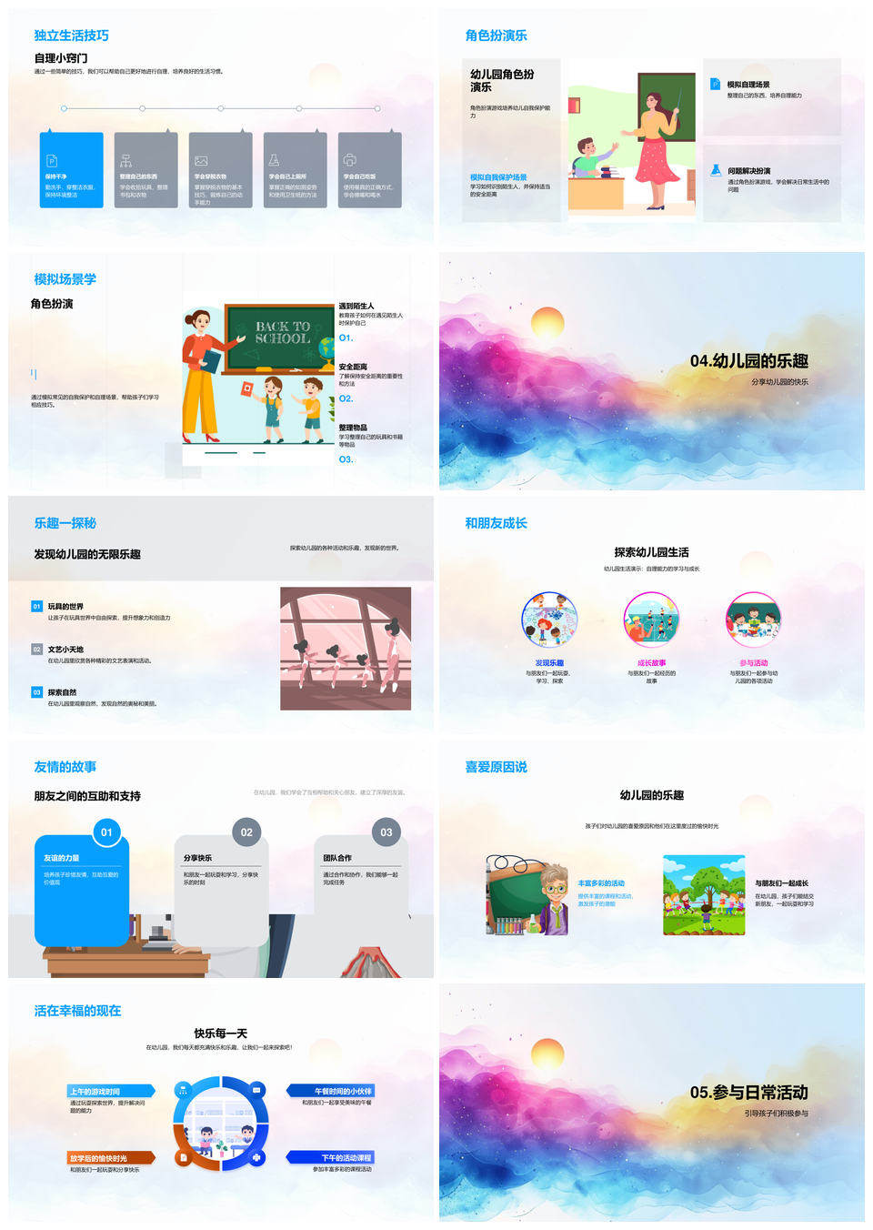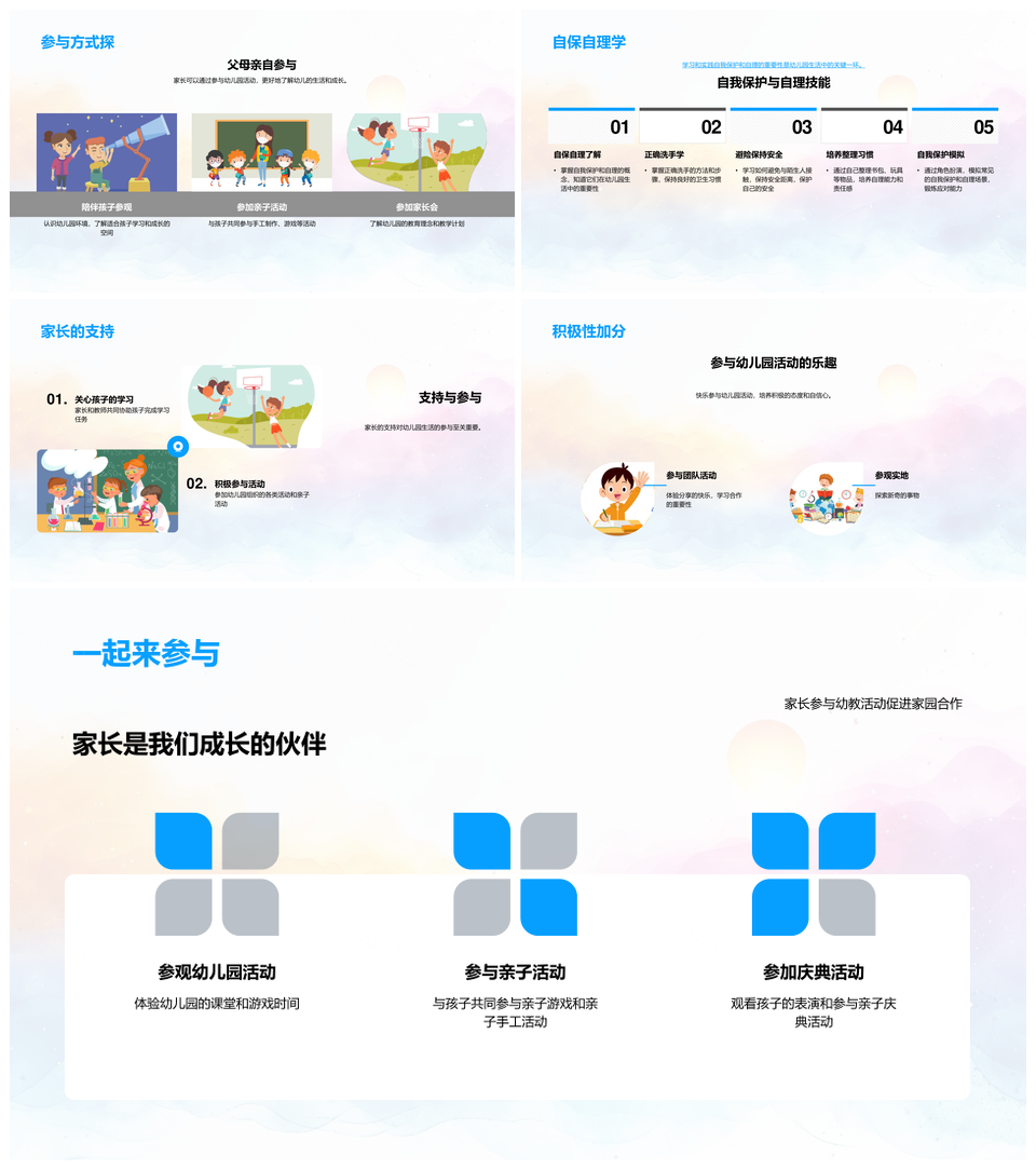 这是一张幼儿园乐学自理安全角色友情成长PPT模板,包含乐学、自理、安全、角色、友情、成长等主题内容,也可用作幼儿园乐学自理安全、乐学自理安全角色、自理安全角色友情、安全角色友情成长、幼儿园乐学自理、乐学自理安全、自理安全角色、安全角色友情、角色友情成长、幼儿园自理安全、乐学角色友情、幼儿园乐学、乐学自理、自理安全、安全角色、角色友情、友情成长等PPT场景使用。