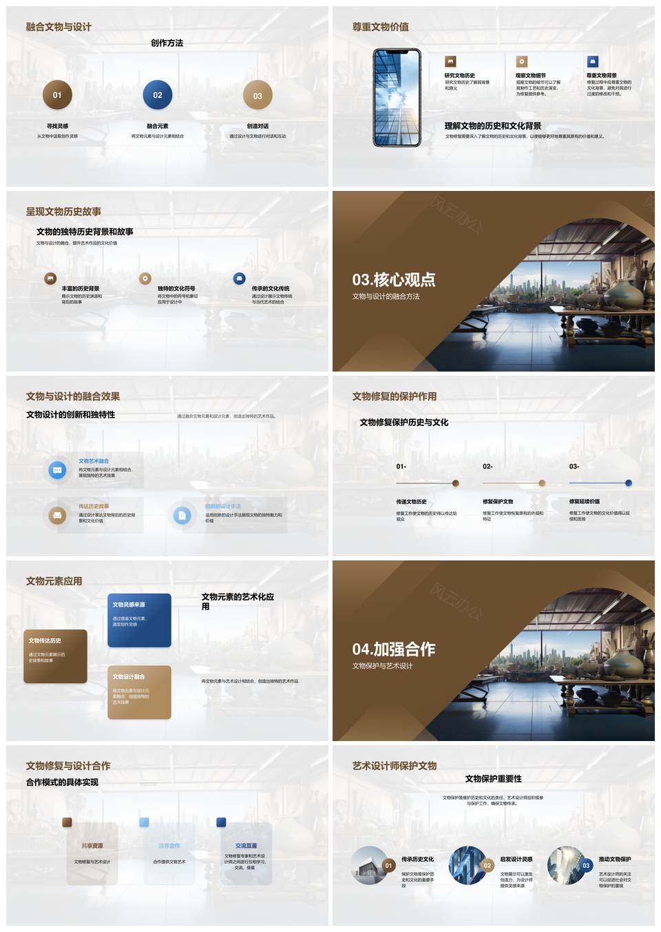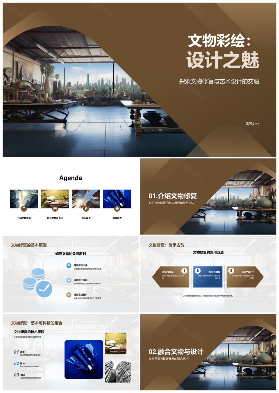 风云办公提供的文物修复艺术设计历史元素展示实践PPT模板,下载格式为pptx,一共19页,作品中文字及图均可以修改和编辑,图片更改请在作品中右键图片并更换,文字修改请直接点击文字进行修改。