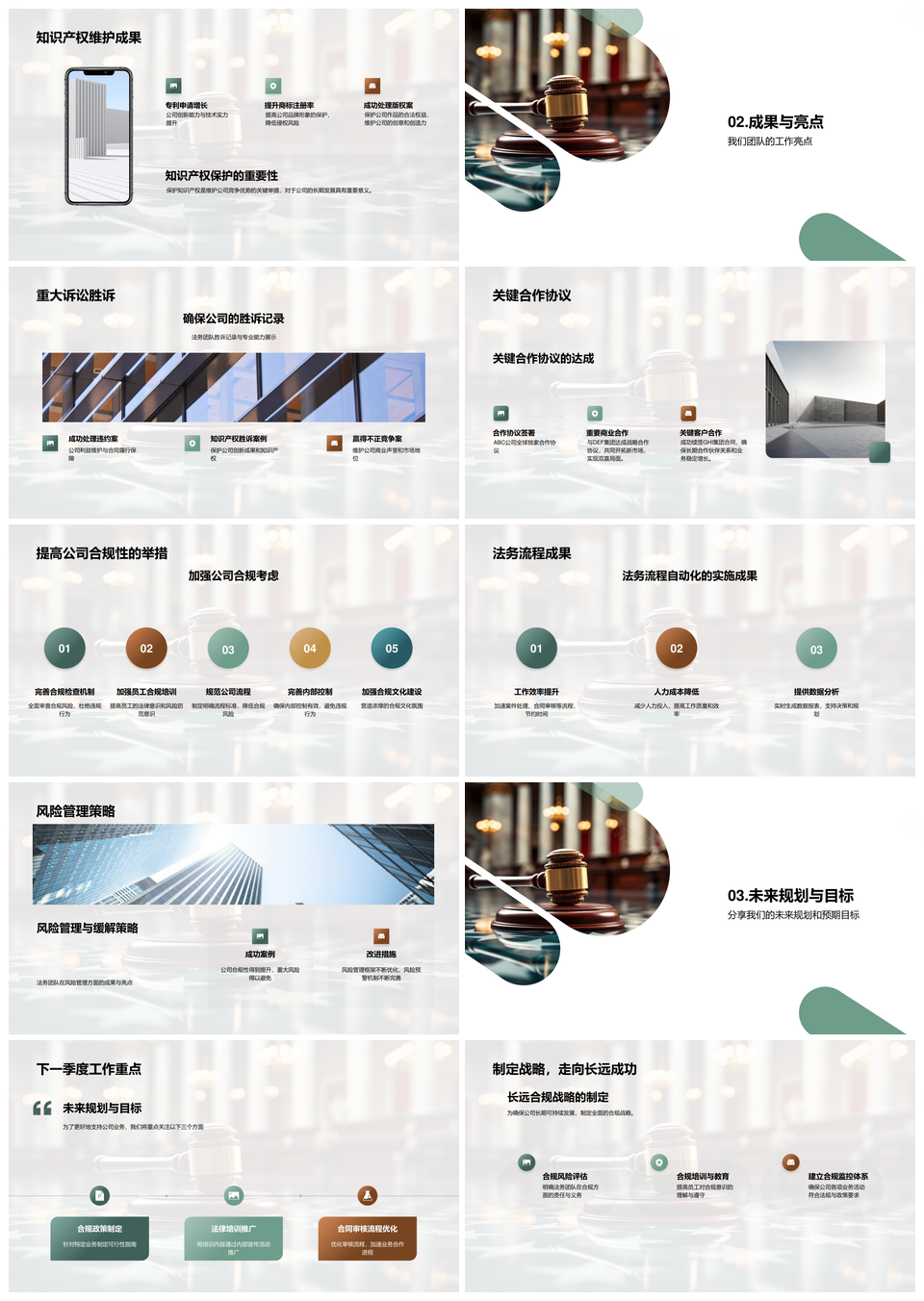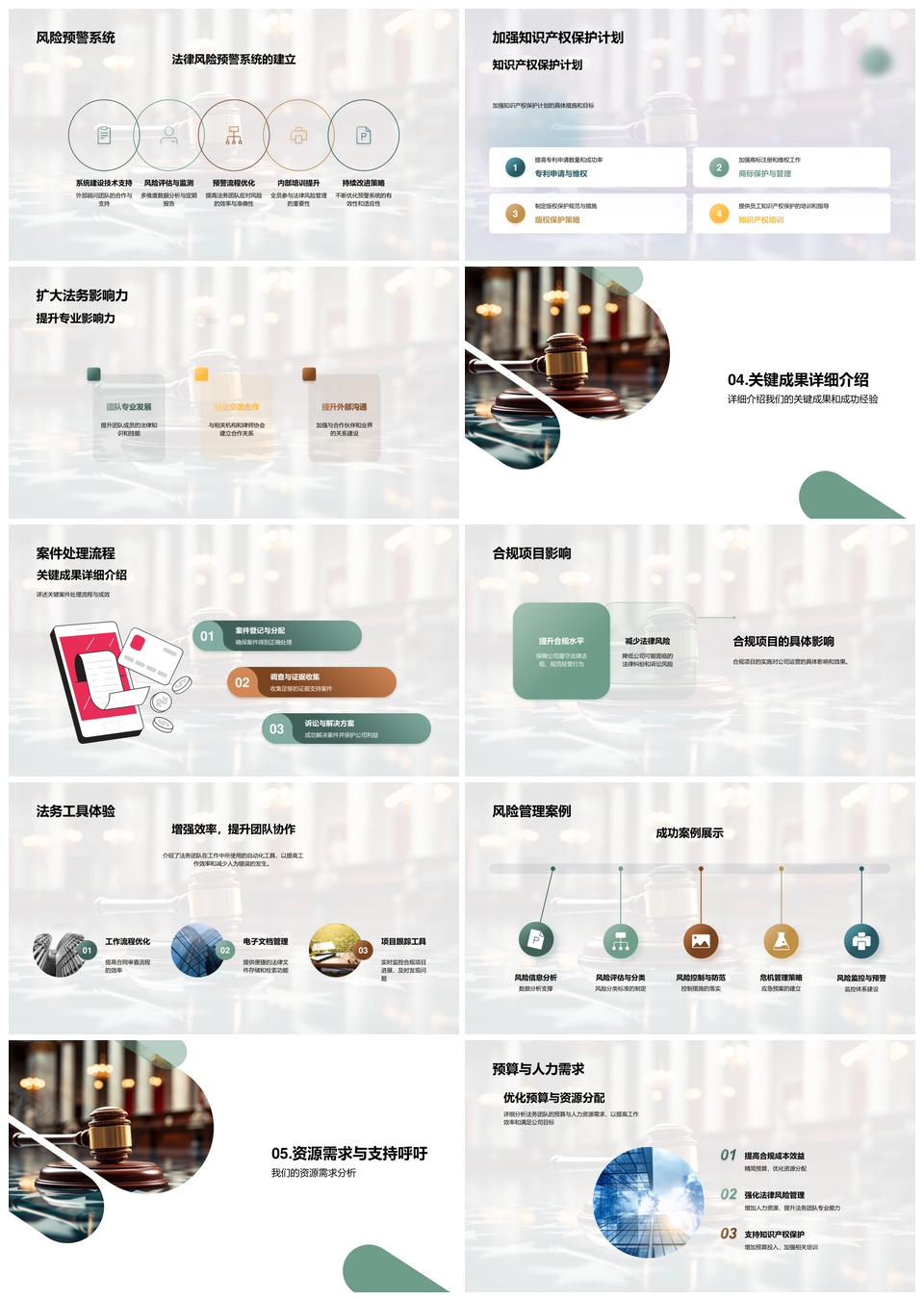 这是一张法务季度案件管理合规推进合同优化知产成果复盘PPT模板,包含法务、季度、案件管理、合规、推进、合同优化、知产成果、复盘等主题内容,也可用作法务季度案件管理合规推进、合规推进合同优化知产、合同优化知产成果复盘、法务季度案件管理、案件管理合规推进、合规推进合同优化、推进合同优化知产、合同优化知产成果、优化知产成果复盘、法务季度案件、季度案件管理、案件管理合规、管理合规推进、合规推进合同、推进合同优化等PPT场景使用。 风云办公提供的法务季度案件管理合规推进合同优化知产成果复盘PPT模板,下载格式为pptx,一共32页,作品中文字及图均可以修改和编辑,图片更改请在作品中右键图片并更换,文字修改请直接点击文字进行修改。