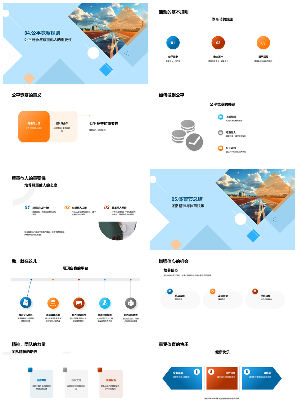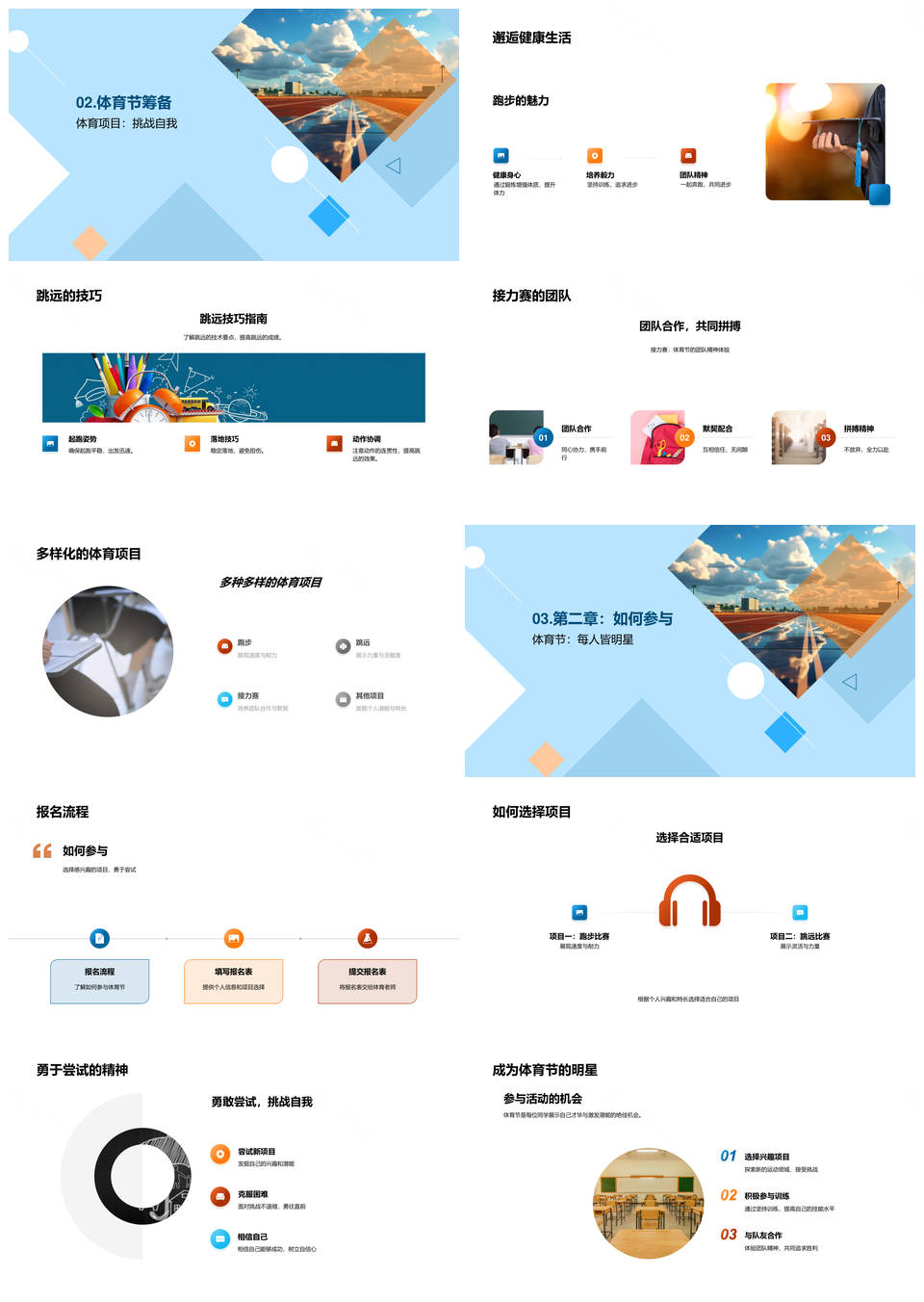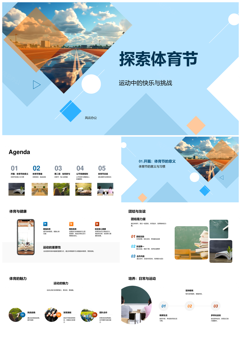 风云办公提供的体育节燃情跑道快乐挑战团结竞技健康PPT模板,下载格式为pptx,一共28页,作品中文字及图均可以修改和编辑,图片更改请在作品中右键图片并更换,文字修改请直接点击文字进行修改。